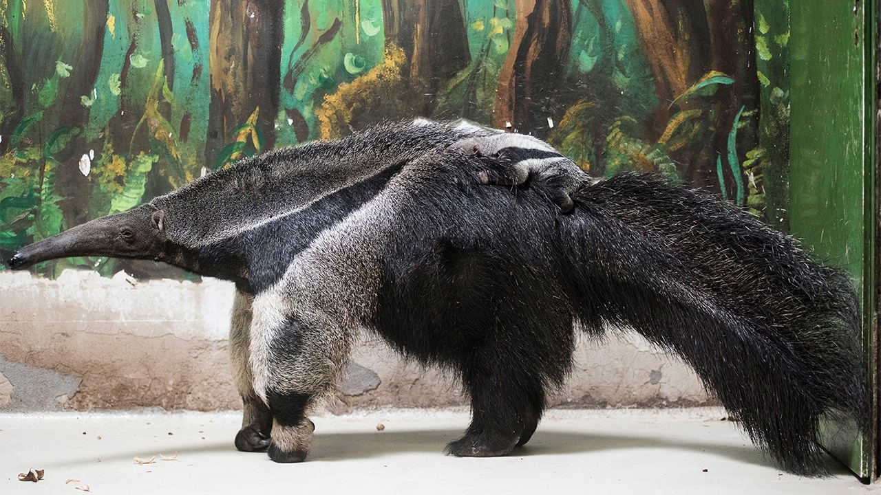ตัวกินมดยักษ์เป็นสัตว์เลี้ยงลูกด้วยนมขนาดใหญ่ไม่มีฟัน การมองเห็นและการได้ยินไม่ดีเท่ากับประสาทสัมผัสรับกลิ่น เนื่องจากมีดวงตาและหูเล็ก ส่วนหัวของมันจะเรียวยาว ขนมีสีน้ำตาลและมีสีดำสลับกับสีขาว มีนิ้ว 5 นิ้วแข็งแรงมากสำหรับการขุด เป็นสัตว์ที่พบในแถบอเมริกากลางและอเมริกาใต้ แม่ตัวกินมดยักษ์จะแบกลูกไว้ที่หลัง ซึ่งเจ้าตัวนี้เพิ่งมีลูกน้อยวัย 2 สัปดาห์ อาศัยอยู่ที่สวนสัตว์ใกล้ๆกรุงบูดาเปสต์ ประเทศฮังการี.