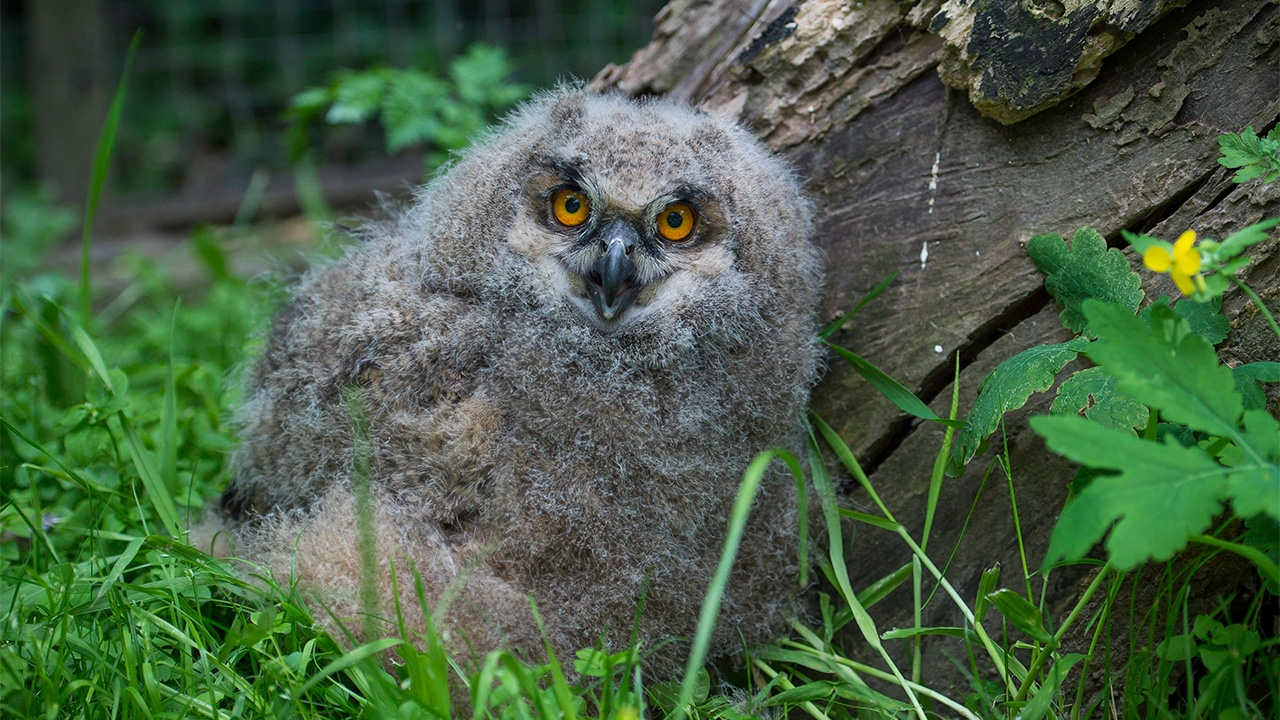 ลูกนกเค้าอินทรียูเรเซีย (Eurasian eagle owl) อายุเพียง 1 เดือน กำลังนั่งอยู่ในพงหญ้าเบียดพิงโคนต้นไม้ในสวนสัตว์ในเมืองเวซสเพรม ตั้งอยู่ทางตะวันตกเฉียงใต้ของกรุงบูดาเปสต์ ประเทศฮังการี นกฮูกชนิดนี้เป็นสายพันธุ์นักล่าที่มีขนาดใหญ่และมีความแข็งแรง ปีกของมันได้รับการยืนยันว่าแข็งแรง และมักจะสร้างรังในพื้นที่เข้าถึงได้ยากลำบาก เช่น หน้าผา ในถ้ำ เป็นนกที่พบได้ทั้งในทวีปเอเชียและยุโรป.