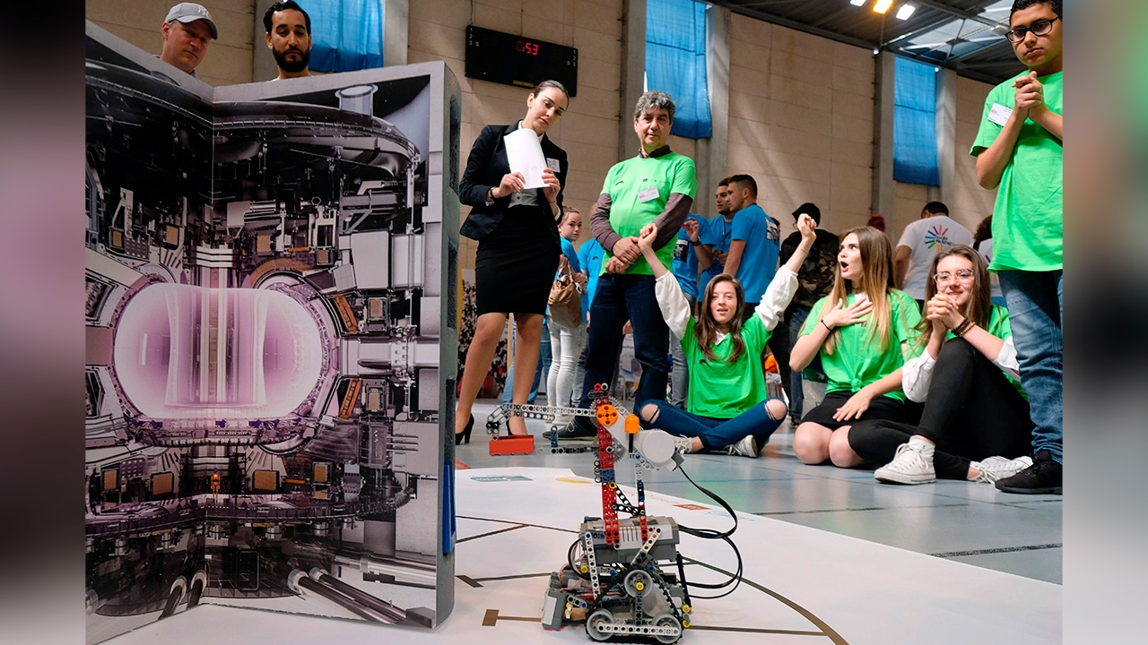 เหล่านักเรียนต่างแสดงปฏิกิริยาต่างๆนานาขณะจ้องดูการเคลื่อนไหวของหุ่นยนต์ตัวเล็กในงานการแข่งขันหุ่นยนต์ ITER–ROBOTS ซึ่งจัดโดย ITER France กับสถาบัน Aix–Marseille Academy เป็นงานที่รวบรวมทีมงานเกี่ยวกับโครงการนวัตกรรมการออกแบบหุ่นยนต์อัตโนมัติ โดยมีการทดสอบหุ่นยนต์ 4 ประเภทที่มีความสามารถทักษะและวิธีการจัดการกับวัสดุ ซึ่งแข่งขันในด้านความเร็ว การติดตาม การขนส่ง จัดขึ้นที่เมืองมาโนสเกอะ ประเทศฝรั่งเศส.
