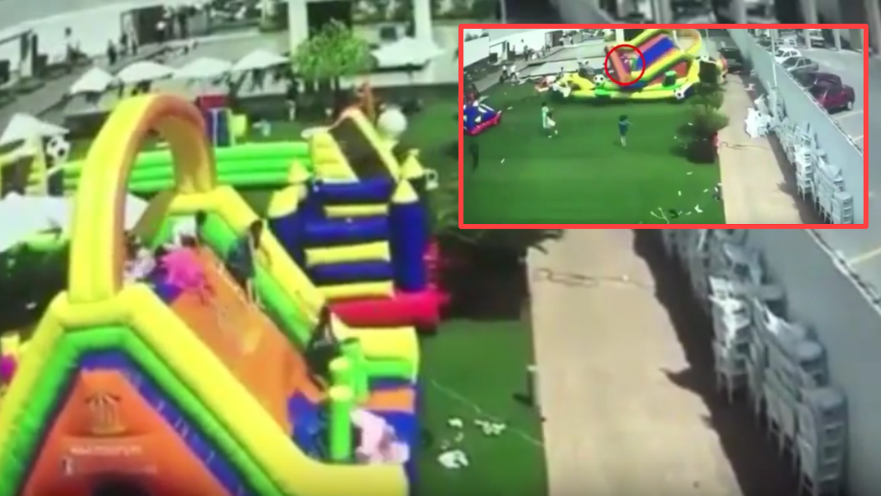 เมื่อ 2 มิ.ย. สื่อต่างประเทศรายงาน และเผยแพร่คลิปวิดีโอที่ได้จากกล้องวงจรปิด แสดงให้เห็นช่วงเวลาเหตุการณ์สุดระทึกที่เกิดกับเด็กหญิง ชาวเม็กซิโก วัย 8 ขวบ และเด็กๆ อีกหลายคน ขณะกำลังเล่นอย่างสนุกสนานอยู่บน ‘บ้านลม’ ที่เป็นรูปปราสาท และมีสไลเดอร์ที่สวนเด็กเล่น ในเมืองซาน หลุยส์ โปโตซี รัฐซาน หลุยส์ โปโตซี ประเทศเม็กซิโก แต่แล้วจู่ๆ ได้มีลมพายุกระโชกรุนแรง หอบ ‘บ้านลม’ จนปลิวลอยละล่อง