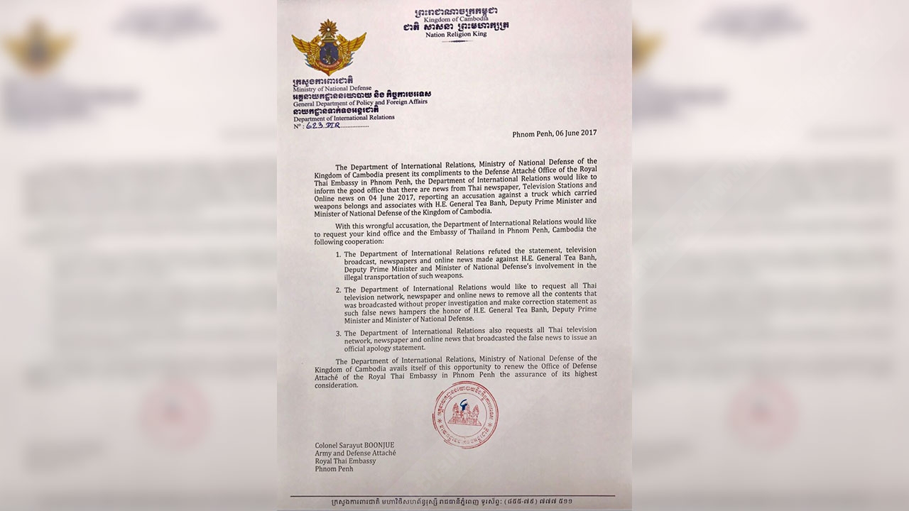 วันที่ 6 มิถุนายน ผู้สื่อข่าวรายงานว่า สำนักวิเทศสัมพันธ์กระทรวงกลาโหมกัมพูชา ออกหนังสือถึงสำนักงานผู้ช่วยทูตทหารไทยประจำกรุงพนมเปญ ประเทศกัมพูชา โดยปฏิเสธรายงานที่ปรากฏในสื่อทั้งโทรทัศน์หนังสือพิมพ์ และสื่อออนไลน์ของประเทศไทย เมื่อวันที่ 4 มิถุนายนที่ผ่านมา ซึ่งระบุว่า รถยนต์บรรทุกอาวุธผิดกฎหมายที่เป็นสิ่งของผิดกฎหมาย มีส่วนเกี่ยวข้องกับ พลเอกเตีย บัน รองนายกรัฐมนตรีและรัฐมนตรีกลาโหมของกัมพูชา ไม่เป็นความจริง