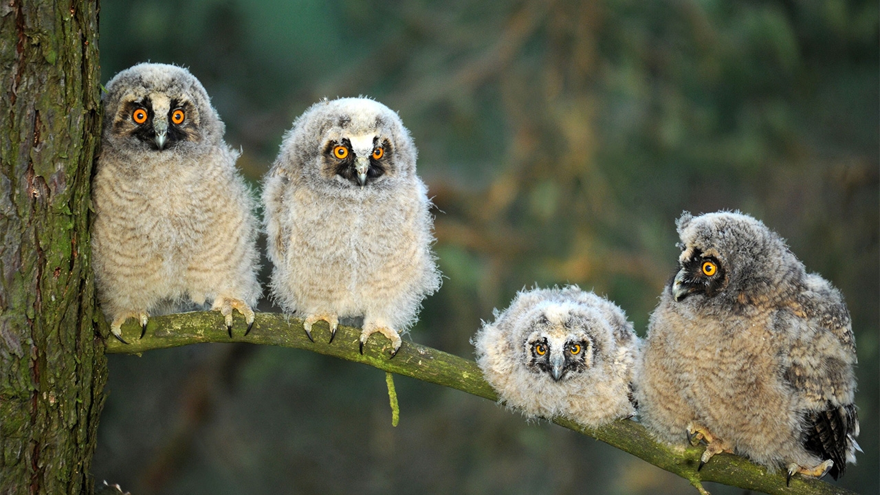 เป็นภาพที่ไม่ค่อยพบเจอกันง่ายๆเมื่อลูกนกฮูกลอง–เอียร์ (Long–eared Owl) ตัวอ้วนพี 4 ตัวมาเกาะเรียงตัวกันอยู่บนกิ่งไม้เล็กๆกิ่งหนึ่งในป่าใกล้หมู่บ้านแห่งหนึ่งในทางตะวันตกเฉียงใต้ของกรุงมินสก์ ประเทศเบลารุส นกฮูกสายพันธุ์นี้มีขนปุกปุย เมื่อโตเต็มวัยขนบนหัวก็จะยาวยื่นขึ้นแลดูคล้ายกับหู ซึ่งนกฮูกลอง–เอียร์เป็นสัตว์ที่มีถิ่นกำเนิดในแถบทวีปอเมริกาเหนือ รวมทั้งในยุโรป เอเชีย และทางตอนเหนือของทวีปแอฟริกา.