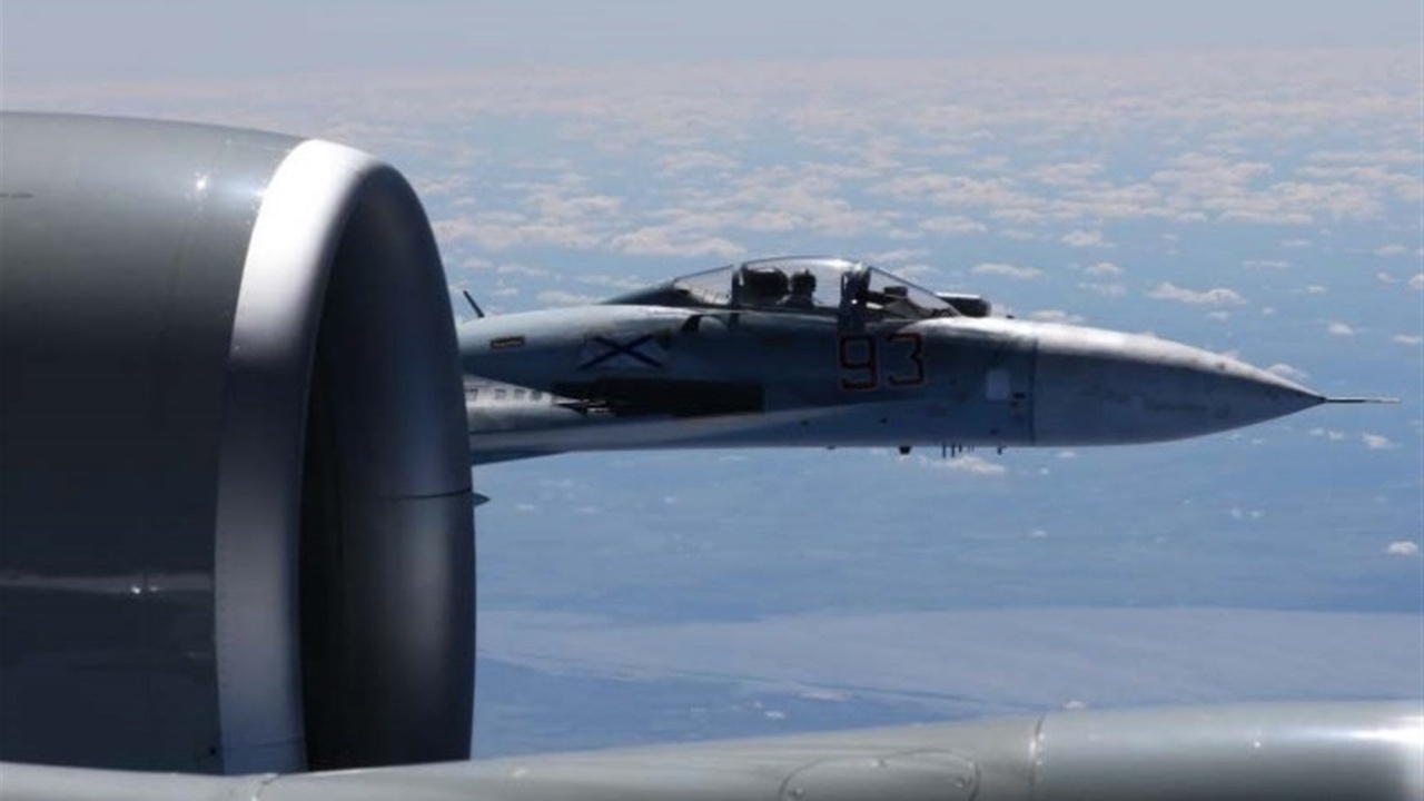 เผยภาพถ่ายจากเจ้าหน้าที่บนเครื่องบินของสหรัฐฯ เผยให้เห็นถึง เครื่องบิน ซู-27 แฟลงเคอร์ ของรัสเซียอยู่ห่างจากเครื่องบินลาดตระเวนหาข่าวและสอดแนม แบบ อาร์ซี -135 ยู ไปไม่กี่ฟีต