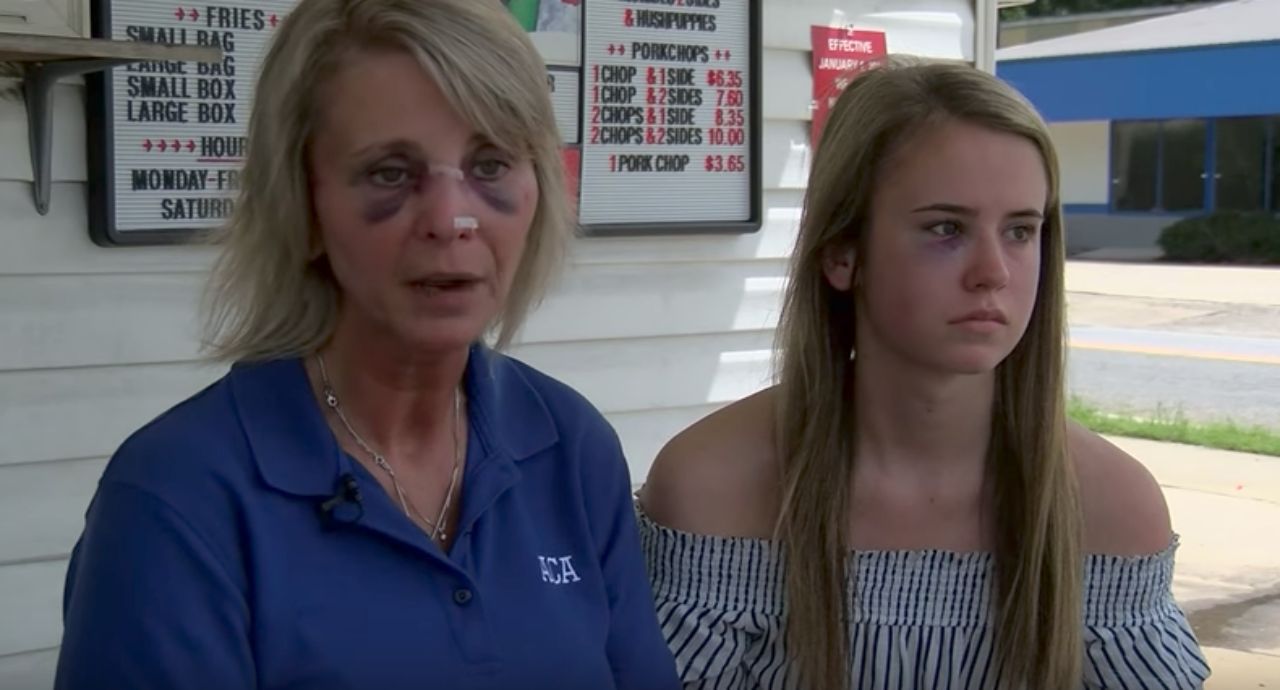 ภาพจากในคลิป แสดงให้เห็นว่า เหตุการณ์ไม่จบแค่นี้ เพราะลูกสาววัย 15 ของนอร์ริส ซึ่งอยู่บนรถปิกอัพ ได้เห็นเหตุการณ์เข้าพอดี ทำให้เธอรีบวิ่งลงจากรถมาช่วยแม่และต่อว่าผู้หญิงที่ทำร้ายแม่เธอ แต่แล้วกลับถูกผู้ชายตัวอ้วนใหญ่ ปล่อยหมัดชกเข้าที่หน้าแบบเต็มๆ จนหงายหลังล้มลงไป แต่เธอก็ยังรีบลุกขึ้นและวิ่งมาดูแม่ด้วยความเป็นห่วง