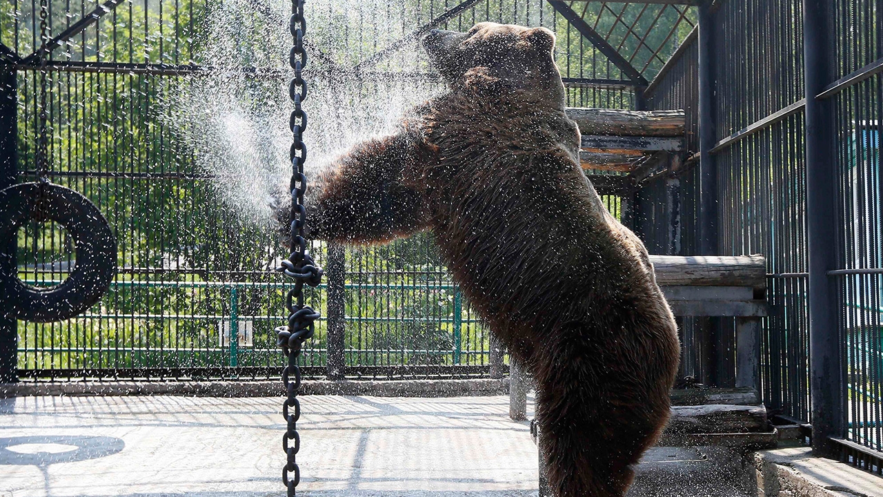 เข้าช่วงหน้าร้อน หลายพื้นที่ทั่วโลกก็มีอุณหภูมิสูงขึ้น แม้แต่ในเขตหนาวอย่างประเทศรัสเซีย เมืองที่ตั้งอยู่ในแถบไซบีเรียก็ยังมีอุณหภูมิพุ่งสูงถึง 34 องศาเซลเซียส เจ้าหน้าที่สวนสัตว์โรเยฟ รูเชย์ ในเมืองครัสโนยาสค์ ก็เลยช่วยให้เจ้าหมีบูยัน ซึ่งเป็นหมีสีน้ำตาลพันธุ์ไซบีเรียได้เล่นน้ำเย็นฉ่ำ หมีตัวยักษ์ก็ยืนรับน้ำที่ฉีดพุ่งเป็นฝอยกระเส็นกระสายภายในกรงขนาดใหญ่ของมันอย่างสนุกสนานหายร้อน.