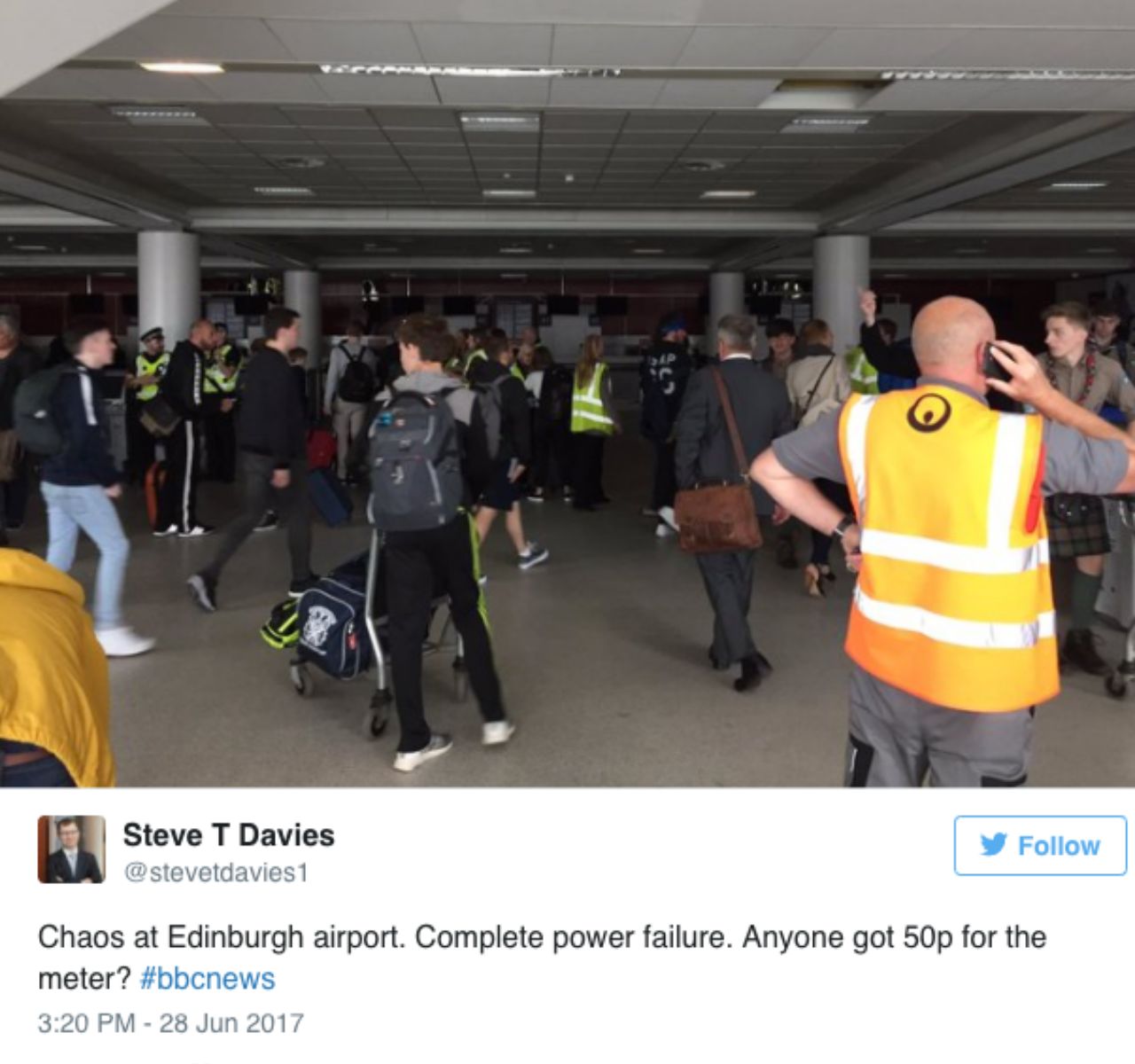 เมื่อ 28 มิ.ย. สำนักข่าวรอยเตอร์และเว็บไซต์ the Sun รายงาน ท่าอากาศยานในเมืองเอดินบะระ เมืองหลวงสกอตแลนด์ เจอปัญหาไฟดับ เมื่อช่วงเช้าวันที่ 28 มิ.ย. ส่งผลกระทบทำให้เที่ยวบินต้องดีเลย์ ล่าช้ากว่ากำหนด เครื่องบินต้องจอดอยู่บนรันเวย์ ระบบโทรคมนาคมใช้ได้แค่เพียงเล็กน้อย และยังทำให้ผู้โดยสารต้องยืนต่อแถวเข้าคิวผ่านการตรวจความปลอดภัยที่อาคารผู้โดยสาร ในความมืด