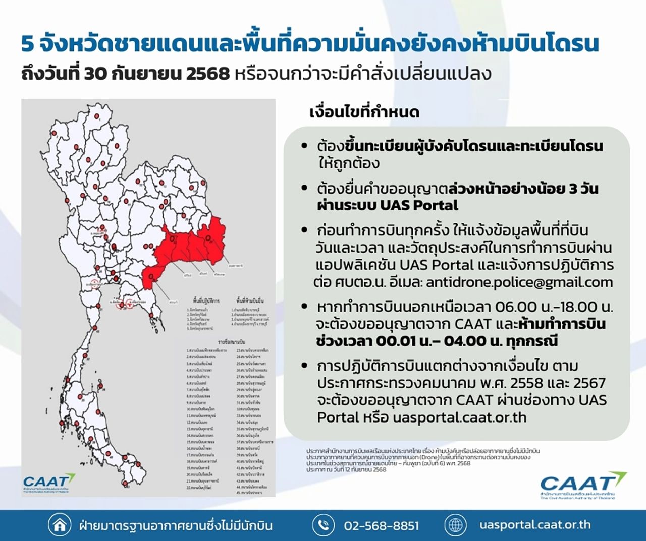 กพท.ออกประกาศฉบับที่ 6 ขยายเวลาห้ามบินโดรนในพื้นที่ 5 จังหวัดชายแดนกัมพูชา และพื้นที่ความมั่นคง จนถึงวันที่ 30 ก.ย.68