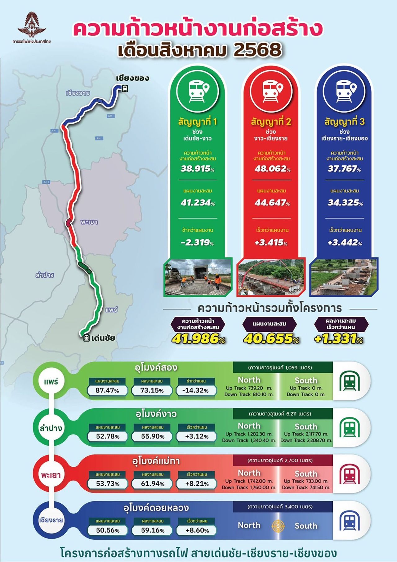 ผู้สื่อข่าวรายงานจากการรถไฟแห่งประเทศไทย (รฟท.) ว่า ขณะนี้การรถไฟได้เร่งดำเนินการก่อสร้างโครงการรถไฟทางคู่สายเด่นชัย-เชียงราย-เชียงของ ระยะทางรวม 323.10 กิโลเมตร (กม.) มูลค่า 85,345 ล้านบาท ปัจจุบันพบว่ามีความคืบหน้าในภาพรวมโครงการงานก่อสร้างอยู่ที่ 41.986% ขณะที่ความก้าวหน้างานโยธาอยู่ที่ 40.656% เร็วกว่าแผนประมาณ 1.331% โดยโครงการนี้เป็นส่วนหนึ่งของการยกระดับโครงข่ายรางไทย สู่การเป็นศูนย์กลางการขนส่งภูมิภาค โดยจะช่วยลดต้นทุนการขนส่งสินค้า เพิ่มขีดความสามารถการแข่งขันของประเทศ และรองรับการท่องเที่ยวภาคเหนือที่กำลังเติบโต คาดว่าก่อสร้างแล้วเสร็จพร้อมเปิดให้บริการภายในปี 2571