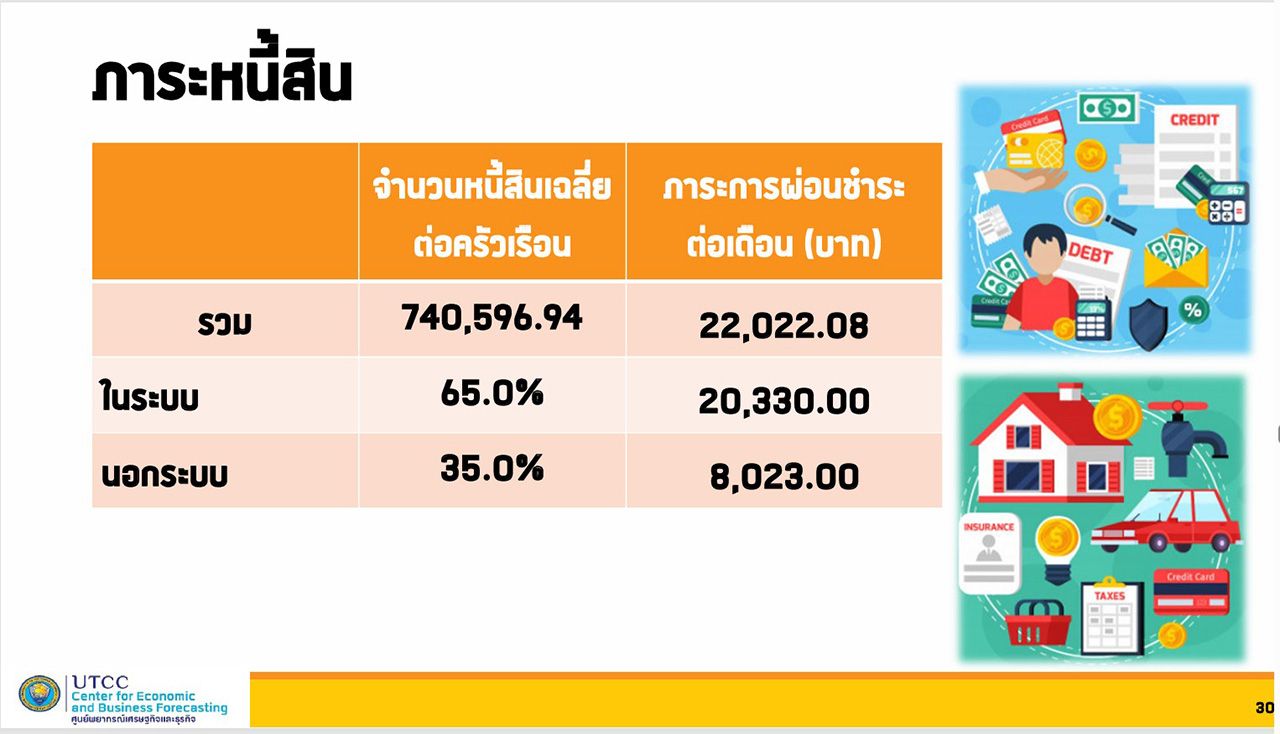 ทั้งนี้ มีการผ่อนชำระต่อเดือนที่ 20,290 บาท เพิ่มขึ้นจากปีก่อนที่ผ่อนชำระ 18,787 บาท เป็นในระบบ 18,165 บาท และนอกระบบ 7,170 บาท โดยผู้ตอบมากกว่าครึ่ง หรือ 50.9% มีหนี้ทั้งในและนอกระบบ ขณะที่ 33.7% มีเฉพาะหนี้นอกระบบ และ 15.4% มีเฉพาะหนี้ในระบบ คาดว่า อีก 6 เดือนข้างหน้า มากถึง 31.1% สถานการณ์หนี้จะแย่ลงเล็กน้อยถึงรุนแรงขึ้น, 15% ไม่แน่ใจ, 14.7% เท่าเดิม และ 39.2% ดีขึ้นเล็กน้อยถึงมาก