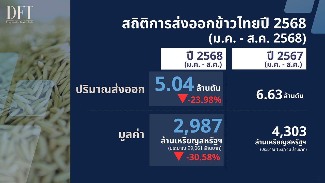 นางอารดา เฟื่องทอง อธิบดีกรมการค้าต่างประเทศ เปิดเผยว่า ช่วง 8 เดือน (ม.ค.-ส.ค.) ปี 68 ไทยส่งออกข้าวปริมาณ 5.04 ล้านตัน ลดลง 23.98% จากช่วงเดียวกันของปี 67 ที่ส่งออก 6.63 ล้านตัน คิดเป็นมูลค่า 2,987 ล้านเหรียญสหรัฐฯ ประมาณ 99,061 ล้านบาท ลดลง 30.58% จากปี 67 ที่มีมูลค่า 4,303 ล้านเหรียญฯ (ประมาณ 153,913 ล้านบาท) เพราะผลผลิตข้าวในตลาดโลกเพิ่มขึ้น กดดันราคา, ผู้นำเข้าสำคัญอย่างอินโดนีเซียและฟิลิปปินส์ชะลอการนำเข้า และค่าเงินบาทแข็งค่าถึง 7% ขณะที่ค่าเงินของอินเดียและเวียดนามอ่อนค่า 3-5% ส่งผลให้ไทยรั้งอันดับ 3 ผู้ส่งออกข้าวมากสุดในโลก รองจากอินเดีย และเวียดนาม ที่ช่วง 7 เดือนส่งออกได้กว่า 13 ล้านตัน และกว่า 5 ล้านตันตามลำดับ