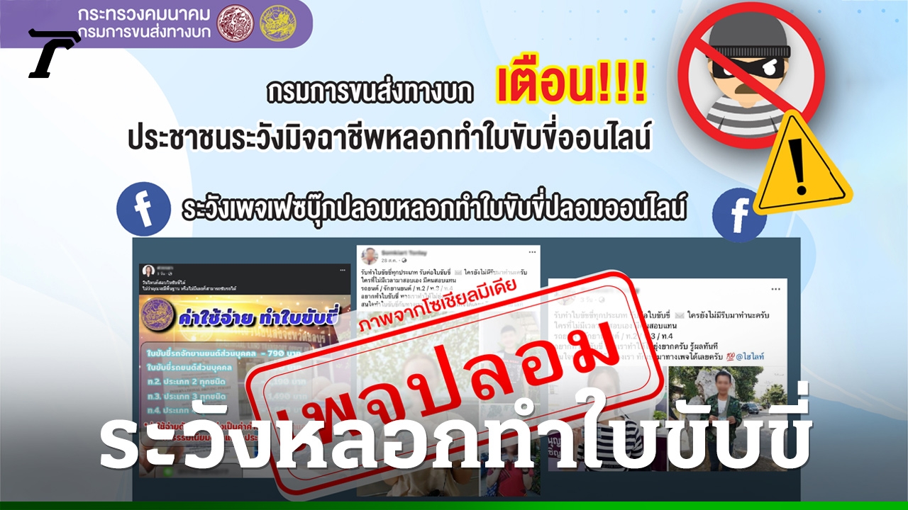 "กรมการขนส่งทางบก" เตือน ระวังมิจฉาชีพหลอกทำใบขับขี่ปลอมออนไลน์ หากต้องการทำหรือต่ออายุใบขับขี่ต้องมาดำเนินการที่กรมการขนส่งทางบก หรือสำนักงานขนส่งทั่วประเทศเท่านั้น