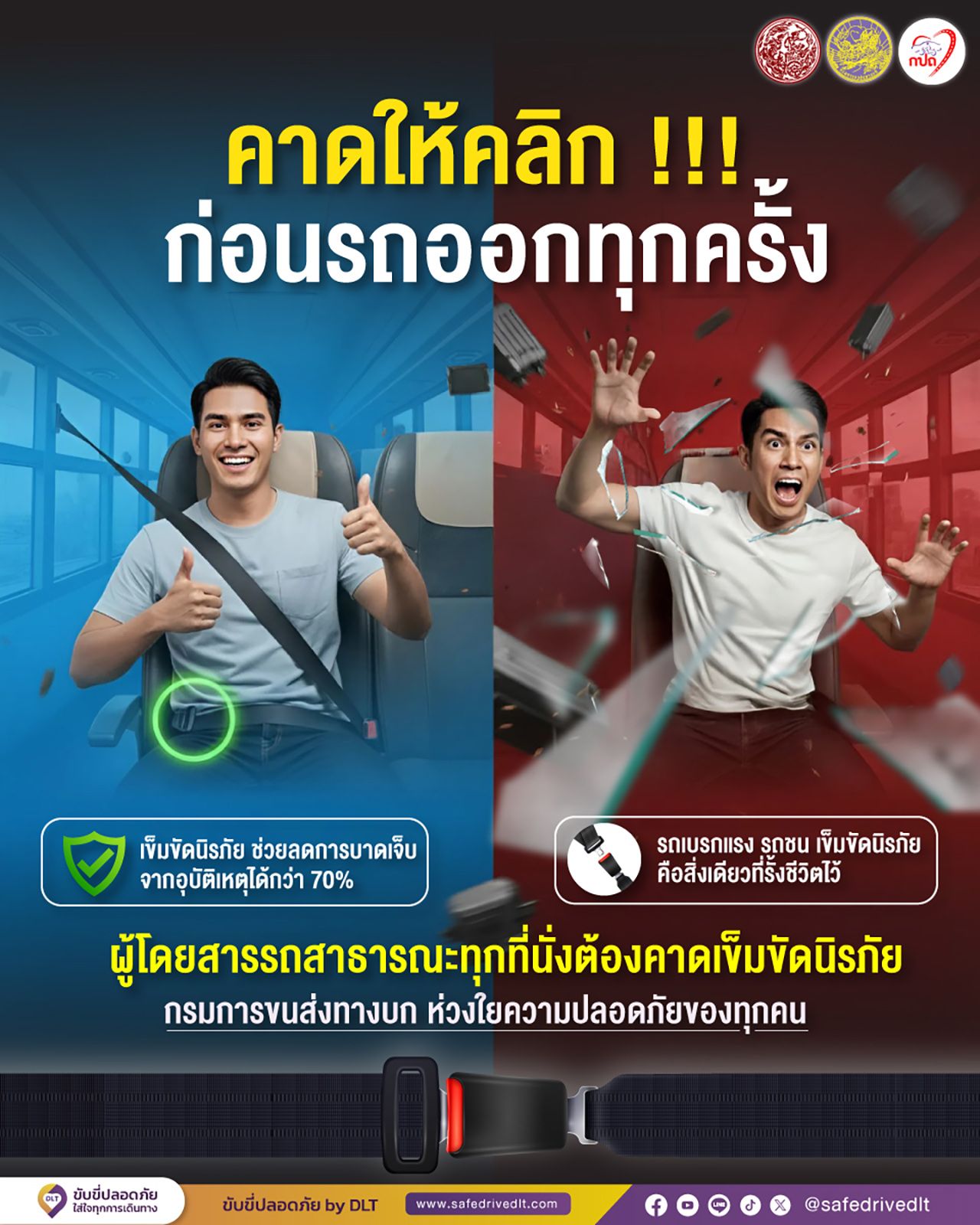 ขนส่งทางบก รณรงค์ “คาดให้คลิก!!! ก่อนรถออกทุกครั้ง” เน้นย้ำผู้โดยสารรถโดยสารสาธารณะทุกที่นั่งต้องคาดเข็มขัดนิรภัย เพื่อความปลอดภัยตลอดการเดินทาง