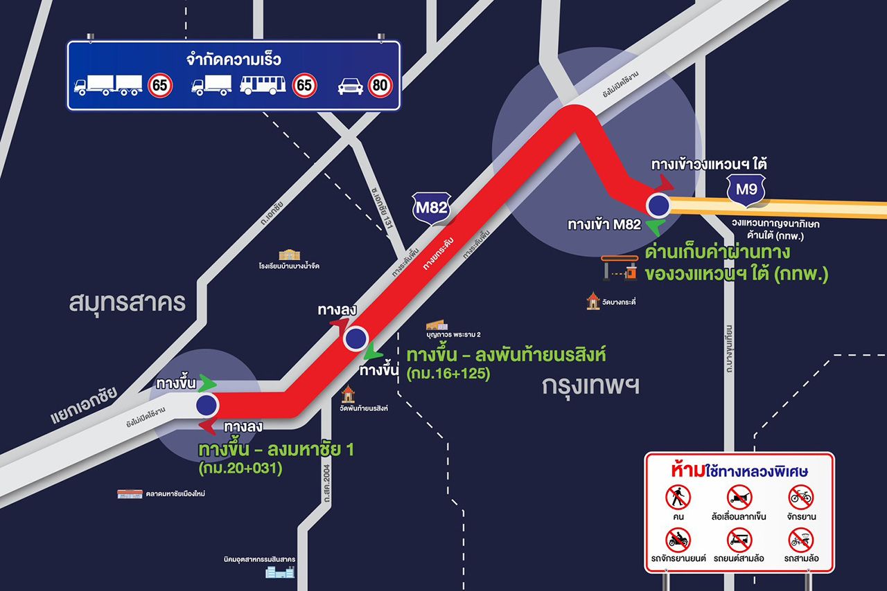 เปิดแล้ววันนี้ มอเตอร์เวย์ M82 บางขุนเทียน-เอกชัย เริ่มใช้ได้ตั้งแต่เวลา 16:00 น. ของวันที่ 22 ตุลาคม 2568 เป็นต้นไป ทดลองวิ่งฟรีระยะทางประมาณ 10.3 กิโลเมตร เชื่อมต่อถนนวงแหวนกาญจนาภิเษกด้านใต้