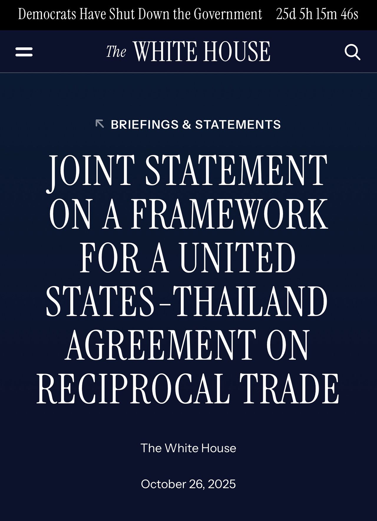 ไทย-สหรัฐฯ ประกาศแถลงการณ์ร่วมว่าด้วยกรอบความตกลงการค้าต่างตอบแทน มุ่งยกระดับความร่วมมือทางเศรษฐกิจ และรักษาความสามารถในการแข่งขันของผู้ประกอบการไทยในตลาดสหรัฐฯ