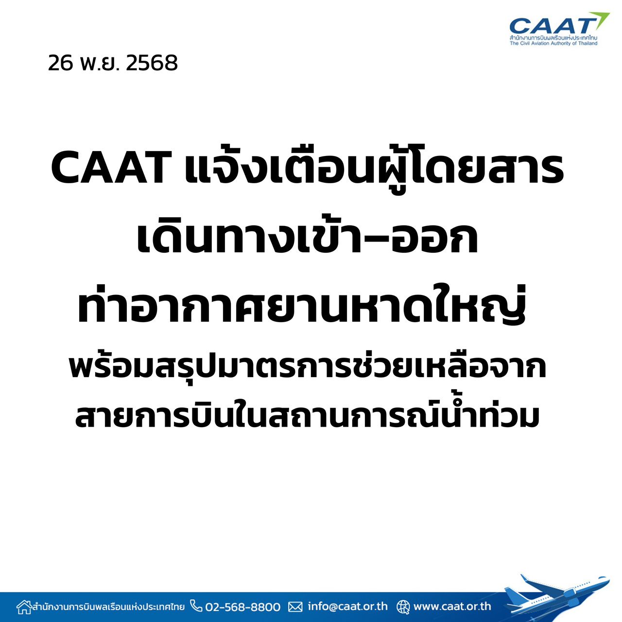 พลอากาศเอกมนัท ชวนะประยูร ผู้อำนวยการสำนักงานการบินพลเรือนแห่งประเทศไทย (CAAT) หรือ กพท. แจ้งว่า จากสถานการณ์น้ำท่วมในพื้นที่ อำเภอหาดใหญ่ จังหวัดสงขลา ซึ่งยังมีระดับน้ำสูงในหลายจุด ส่งผลให้การเดินทางเข้า-ออกท่าอากาศยานหาดใหญ่อาจประสบความลำบาก โดยเฉพาะรถรับ-ส่งผู้โดยสารของหน่วยงานรัฐที่จัดไว้ ซึ่งอาจไม่สามารถให้บริการได้ในบางช่วงเวลา ทำให้ผู้โดยสารอาจได้รับผลกระทบด้านความสะดวกในการเดินทาง CAAT ขอความร่วมมือผู้โดยสารพิจารณาความจำเป็นในการเดินทางในช่วงที่สถานการณ์น้ำยังไม่เสถียร หากต้องเดินทางไปหาดใหญ่ ควรมีผู้มารับที่สนามบินได้อย่างแน่นอน หากต้องเดินทางออกจากหาดใหญ่ให้เผื่อเวลาเดินทางไปสนามบินเพิ่มขึ้นอย่างมากเนื่องจากเส้นทางบางช่วงยังมีน้ำท่วม ทั้งนี้ โปรดติดตามสถานการณ์ล่าสุดจากสายการบิน เพื่อหลีกเลี่ยงการตกค้างในสนามบิน ซึ่งอาจมีข้อจำกัดด้านอาหาร น้ำดื่ม และพื้นที่พักคอย