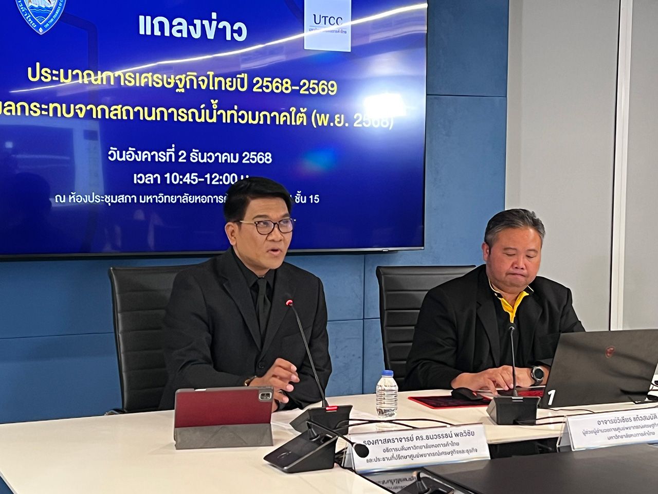 ในส่วนของศูนย์พยากรณ์เศรษฐกิจและธุรกิจ มหาวิทยาลัยหอการค้าไทย ประเมินเบื้องต้นในกรอบระยะเวลา 1 เดือน ผลกระทบน้ำท่วมภาคใต้ 10 จังหวัด มีประชาชนได้รับผลกระทบกว่า 2.19 ล้านคน หรือราว 798,600 ครัวเรือน โดยจังหวัดสงขลา ได้รับผลกระทบสูงสุด คิดเป็น 60% ของความเสียหายทั้งหมด รองลงมา ได้แก่ นครศรีธรรมราช และ พัทลุง เบื้องต้นในกรอบระยะเวลา 1 เดือน ประเมินว่าจะมีความเสียหายประมาณ 1,000-1,500 ล้านบาทต่อวัน ในช่วงสถานการณ์รุนแรง หรือรวมกว่า 40,000 ล้านบาท คิดเป็นความเสียหาย 0.22% ต่อจีดีพี โดยภาคท่องเที่ยวและบริการมีมูลค่าความเสียหายมากที่สุดสูงกว่า 22,000 ล้านบาท เนื่องจากเป็นช่วงไฮซีซันของภาคการท่องเที่ยวและจะมีนักท่องเที่ยวชาวต่างชาติเข้ามาท่องเที่ยวภาคใต้จำนวนมากในช่วงเวลาดังกล่าว ธุรกิจค้าปลีก ร้านอาหารและโรงแรมต้องปิดกิจการชั่วคราว และผลกระทบต่อเนื่องจากการยกเลิกซีเกมส์ทำลายความเชื่อมั่นและโอกาสทางเศรษฐกิจ รองลงมาคือ ภาคเกษตรกรรม ราว 10,000 ล้านบาท และภาคการผลิตและสาธารณูปโภค ประมาณ 6,800 ล้านบาท