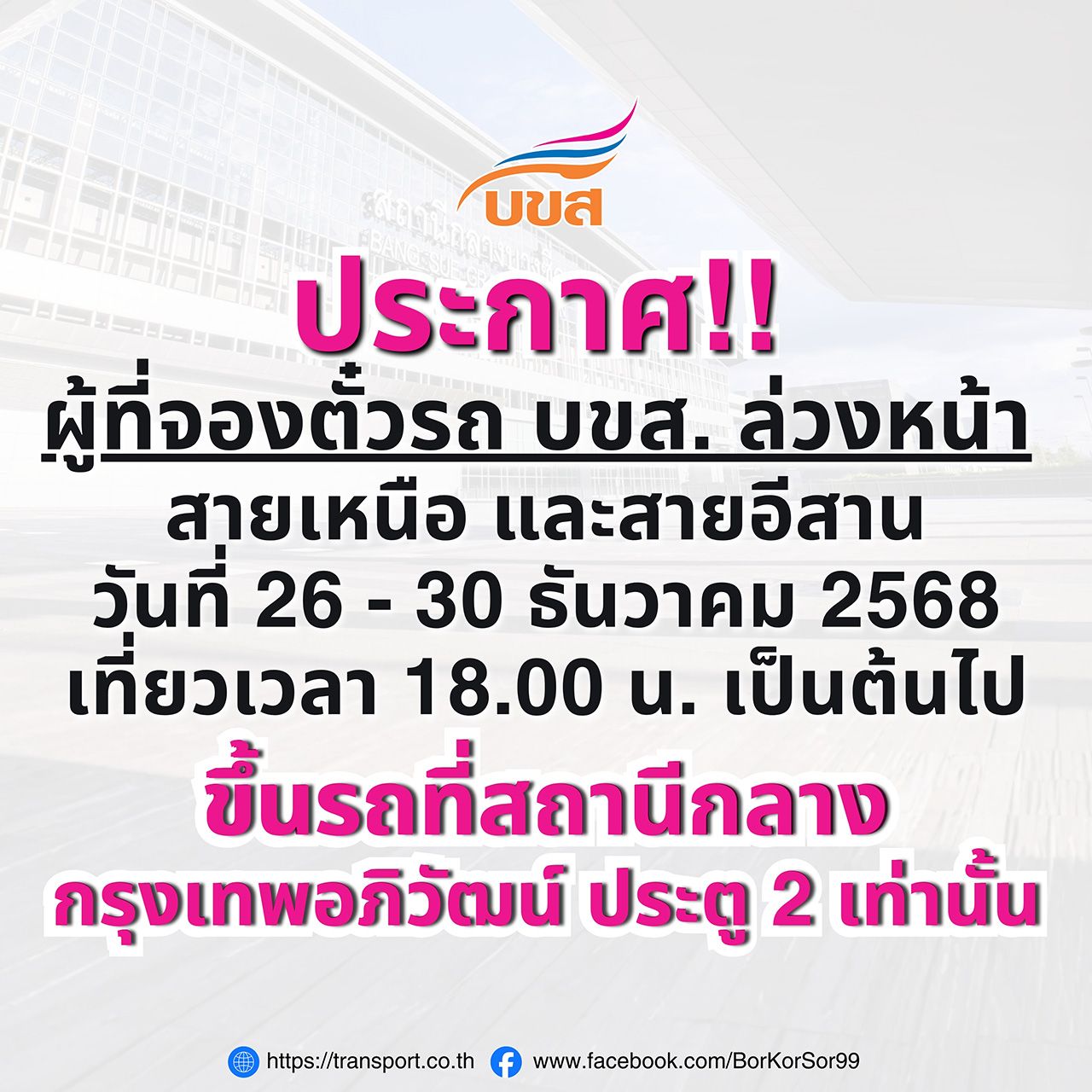 ผู้โดยสารที่จองตั๋วล่วงหน้าของ บขส. เส้นทางภาคเหนือ และภาคตะวันออกเฉียงเหนือ (อีสาน) ตั้งแต่เที่ยวเวลา 18.00 น. เป็นต้นไป ของวันที่ 26 – 30 ธันวาคม 2568 ให้ไปขึ้นรถที่สถานีกลางกรุงเทพอภิวัฒน์ ประตู 2 โดยผู้โดยสารสามารถเดินทางมายังสถานีกลางกรุงเทพอภิวัฒน์ทั้งรถไฟฟ้าสายสีน้ำเงิน รถไฟฟ้าสายสีแดง รถเมล์ และรถแท็กซี่ เพื่อขึ้นรถ บขส. ได้อย่างสะดวก รวดเร็ว และลดความแออัดภายในสถานีขนส่งฯ รวมทั้งขอแนะนำผู้โดยสาร ตรวจสอบ “จุดขึ้นรถ” ที่ระบุในตั๋วโดยสาร และเผื่อเวลาเดินทางมาขึ้นรถอย่างน้อย 1 ชั่วโมง เพื่อความสะดวกและรวดเร็วในการเดินทาง