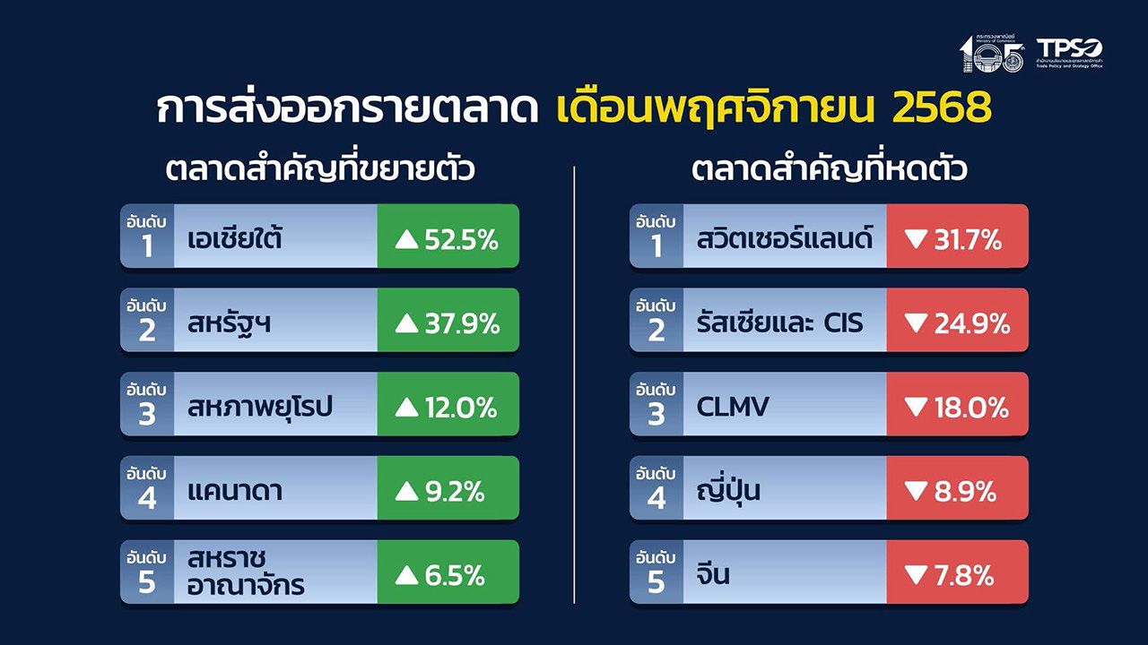 ส่วนตลาดส่งออก ส่วนใหญ่ชะลอตัว โดยจีน หดตัว 7.8% หดตัวครั้งแรกในรอบ 14 เดือน, ญี่ปุ่น หดตัว 8.9% ครั้งแรกในรอบ 3 เดือน, ซีแอลเอ็มวี หดตัว 18% แต่สหรัฐฯ ยังขยายตัว 37.9% ต่อเนื่องเป็นเดือนที่ 26, สหภาพยุโรป ขยายตัว 12% เป็นต้น อย่างไรก็ตาม เดือนพ.ย.68 ไทยยังคงขาดดุลการค้าจีนอย่างต่อเนื่องที่ 6,666 ล้านเหรียญฯ และช่วง 11 เดือน ขาดดุล 60,646 ล้านเหรียญฯ ขณะที่สหรัฐฯ ไทยยังคงได้ดุลต่อเนื่องเช่นกัน เดือนพ.ย.68 ได้ดุล 4,716 ล้านเหรียญฯ และช่วง 11 เดือน ได้ดุล 46,265 ล้านเหรียญฯ