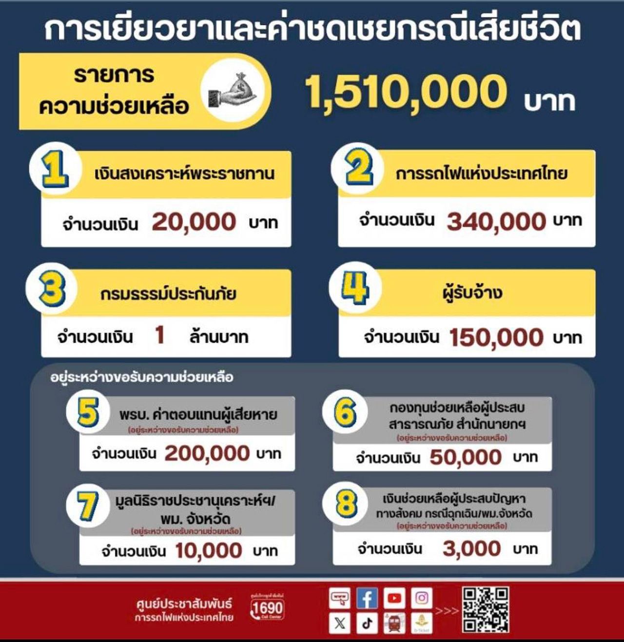 ด้านทรัพย์สิน: รฟท. ได้เปิดช่องทางพิเศษสำหรับผู้โดยสารหรือญาติที่ได้รับผลกระทบด้านทรัพย์สิน เพื่อยื่นคำร้องขอรับการพิจารณาชดเชย โดยมีเจ้าหน้าที่คอยให้คำแนะนำและพิจารณาชดเชยเป็นรายกรณีอย่างเป็นธรรม