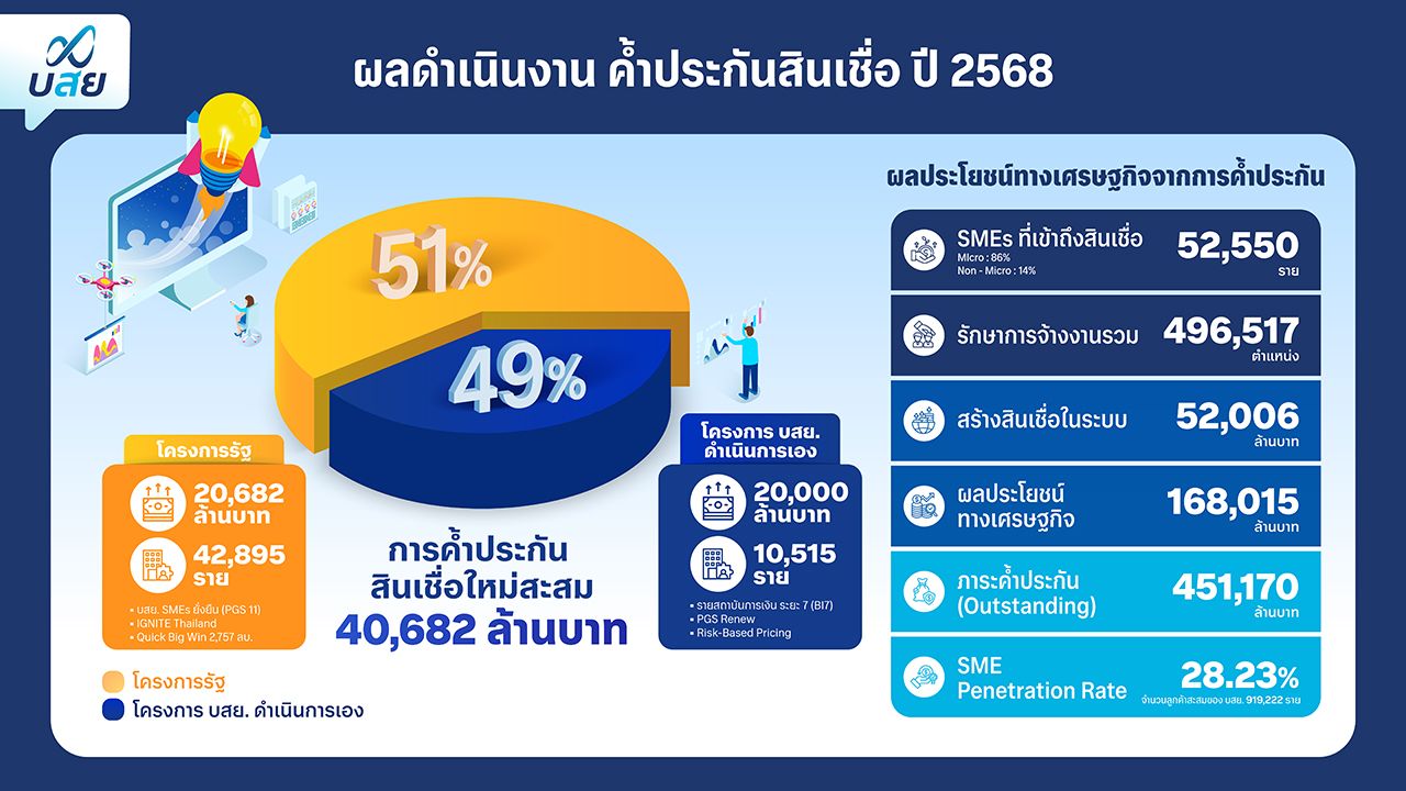 ดร.สิทธิกร ดิเรกสุนทร กรรมการและผู้จัดการทั่วไป บรรษัทประกันสินเชื่ออุตสาหกรรมขนาดย่อม (บสย.) เปิดเผยว่า ผลดำเนินงานปี 2568 บสย. มียอดค้ำประกันสินเชื่อ 40,682 ล้านบาท ภายใต้ 2 โครงการหลัก ได้แก่ โครงการตามมาตรการรัฐ ยอดอนุมัติ 20,682 ล้านบาท คิดเป็น 51% ของยอดค้ำประกัน และ โครงการที่ บสย. ดำเนินการเอง ยอดอนุมัติ 20,000 ล้านบาท คิดเป็น 49% ของยอดค้ำประกัน ช่วย SMEs เข้าถึงสินเชื่อ 52,550 ราย เป็นผู้ประกอบการรายย่อย (Micro SMEs) 86% ค้ำประกัน เฉลี่ย 2 แสนบาทต่อราย อีก 14% เป็น SMEs ทั่วไป ค้ำประกันเฉลี่ย 4.56 ล้านบาทต่อราย ก่อให้เกิดสินเชื่อในระบบสถาบันการเงิน 52,006 ล้านบาท รักษาการจ้างงาน 496,517 ตำแหน่ง และสร้างผลประโยชน์ทางเศรษฐกิจได้มากกว่า 168,015 ล้านบาท