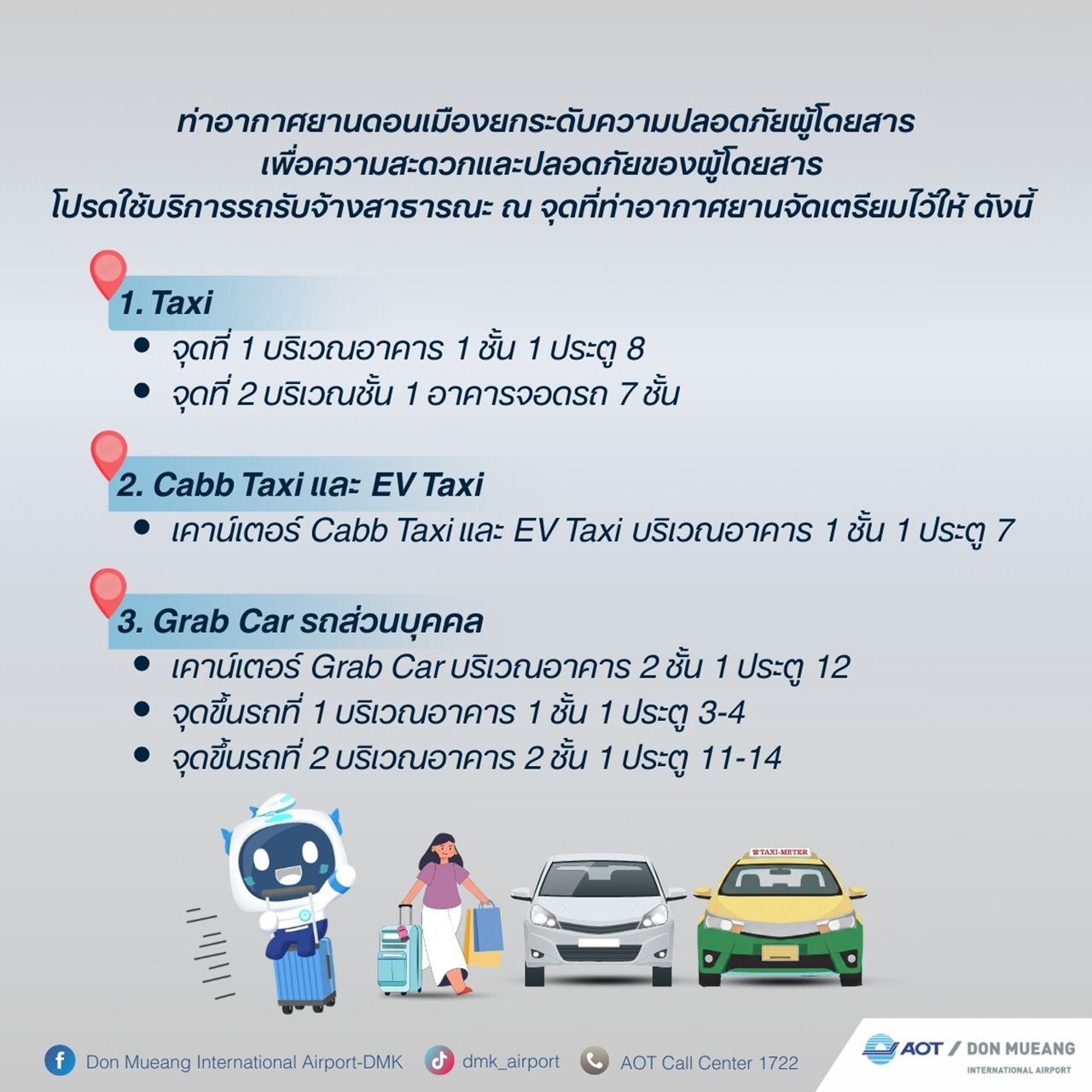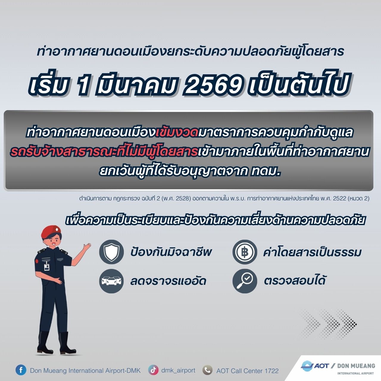 ตั้งแต่วันที่ 1 มีนาคม 2569 เป็นต้นไป ท่าอากาศยานดอนเมือง (ทดม.) เข้มงวดมาตรการควบคุมกำกับดูแล รถรับจ้างสาธารณะที่ไม่มีผู้โดยสารเข้ามาภายในพื้นที่ท่าอากาศยาน ยกเว้นผู้ที่ได้รับอนุญาตจาก ทดม. เพื่อความเป็นระเบียบและการป้องกันความเสี่ยงต่อความปลอดภัยของผู้เดินทาง
