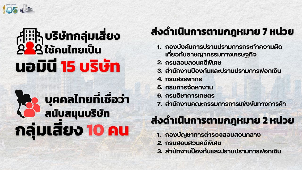 นายพูนพงษ์ นัยนาภากรณ์ อธิบดีกรมพัฒนาธุรกิจการค้า กระทรวงพาณิชย์ เปิดเผยว่า ได้ประชุมร่วมกับ 10 หน่วยงาน เพื่อหารือแนวทางแก้ไขปัญหาราคามะพร้าวน้ำหอมตกต่ำและการตรวจสอบกลุ่มทุนต่างชาติที่ประกอบกิจการล้งผลไม้ โดยพบว่า มีบริษัทกลุ่มเสี่ยงที่ใช้คนไทยถือหุ้นแทน (นอมินี) จำนวน 15 บริษัท แยกเป็นในจังหวัดราชบุรี 11 บริษัท สมุทรปราการ ปทุมธานี สมุทรสาคร และกรุงเทพฯ จังหวัดละ 1 บริษัท และมีคนไทยที่เชื่อว่าสนับสนุนบริษัทดังกล่าวจำนวน 10 คน มีทั้งเป็นผู้ถือหุ้น เป็นกรรมการ ซึ่งบางบริษัทตั้งมาแล้ว 5-6 ปี บางบริษัทเพิ่งตั้งขึ้นมาใหม่
