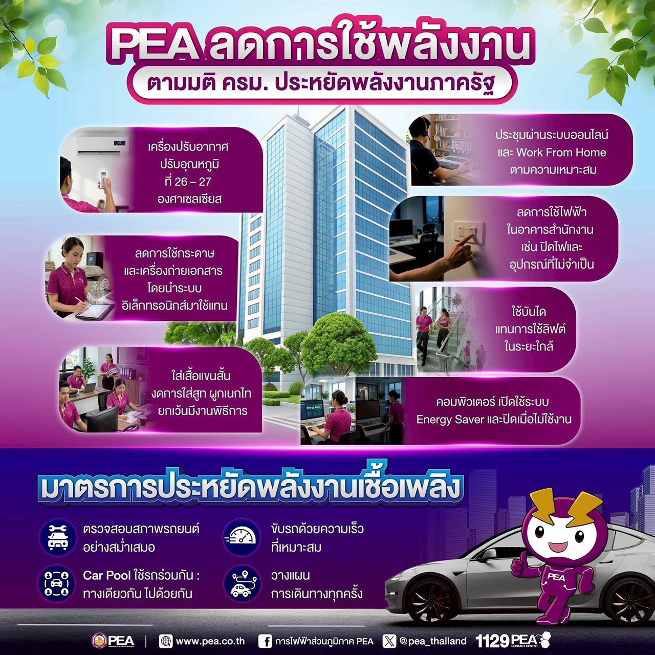 การไฟฟ้าส่วนภูมิภาค (PEA) ขานรับนโยบายของรัฐบาล พร้อมดำเนินมาตรการลดการใช้พลังงานตามมติคณะรัฐมนตรี เพื่อเป็นต้นแบบด้านการประหยัดพลังงานของหน่วยงานภาครัฐ โดยกำหนดแนวทางปฏิบัติภายในองค์กรเพื่อลดการใช้ไฟฟ้า ดังนี้