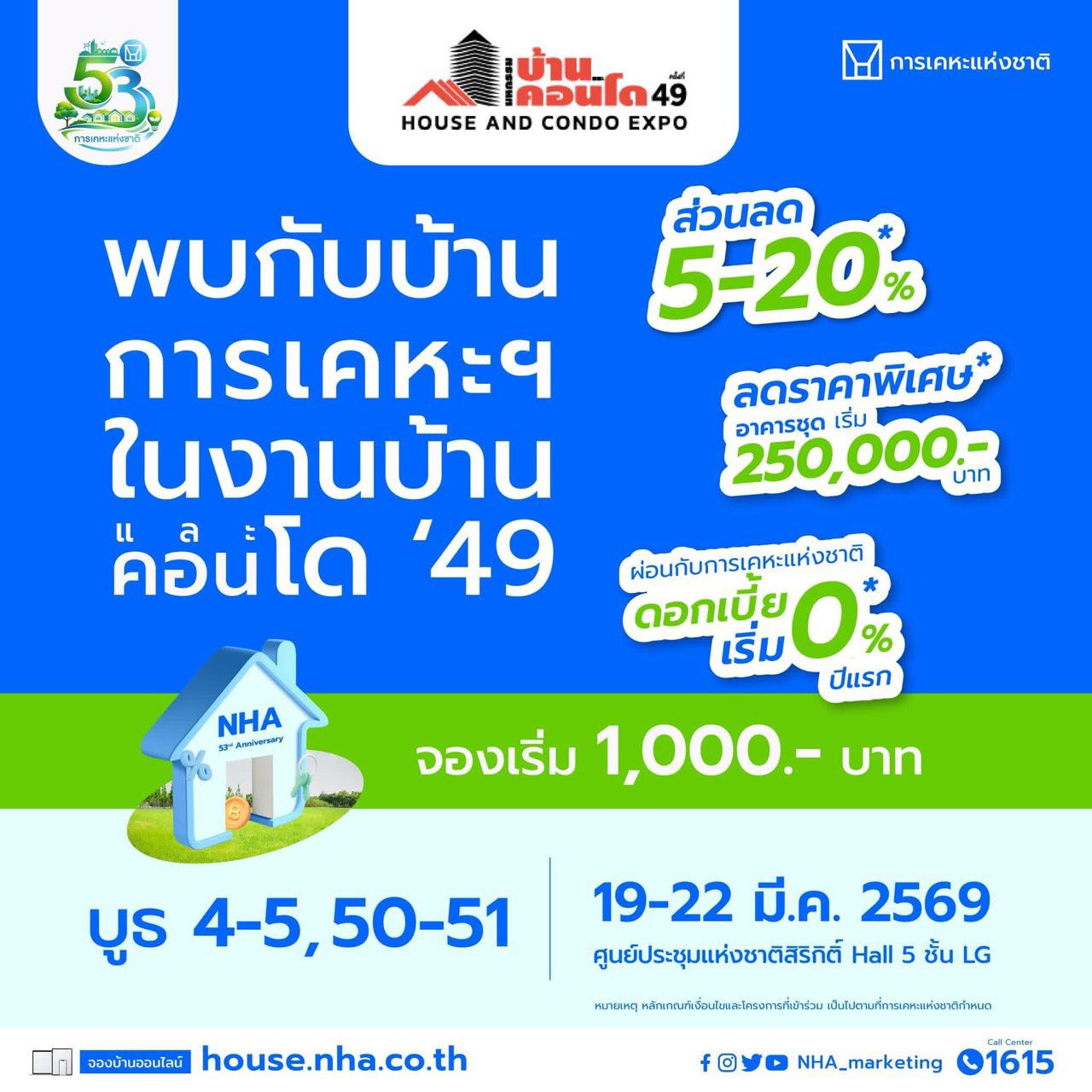 เมื่อวันที่ 19 มีนาคม 2569 การเคหะแห่งชาติ (กคช.) เข้าร่วมออกบูธในงาน “มหกรรมบ้านและคอนโด ครั้งที่ 49” ยกทัพโครงการที่อยู่อาศัยคุณภาพในราคาที่ประชาชนเข้าถึงได้ ภายใต้แนวคิดส่งเสริมให้คนไทยมีที่อยู่อาศัยอย่างมั่นคง ภายในงาน กคช. จัดโปรโมชันพิเศษเนื่องในโอกาสครบรอบ 53 ปี มอบสิทธิประโยชน์หลากหลาย เพื่อเพิ่มทางเลือกให้แก่ผู้สนใจ อาทิ ส่วนลดสูงสุด 5–20% ราคาเริ่มต้นเพียง 250,000 บาท เปิดจองเพียง 1,000 บาท พร้อมสิทธิผ่อนชำระอัตราดอกเบี้ย 0% ในปีแรก รวมถึงการยกเว้นค่าธรรมเนียมการโอนกรรมสิทธิ์ และสิทธิพิเศษอื่น ๆ สำหรับผู้จองภายในงาน