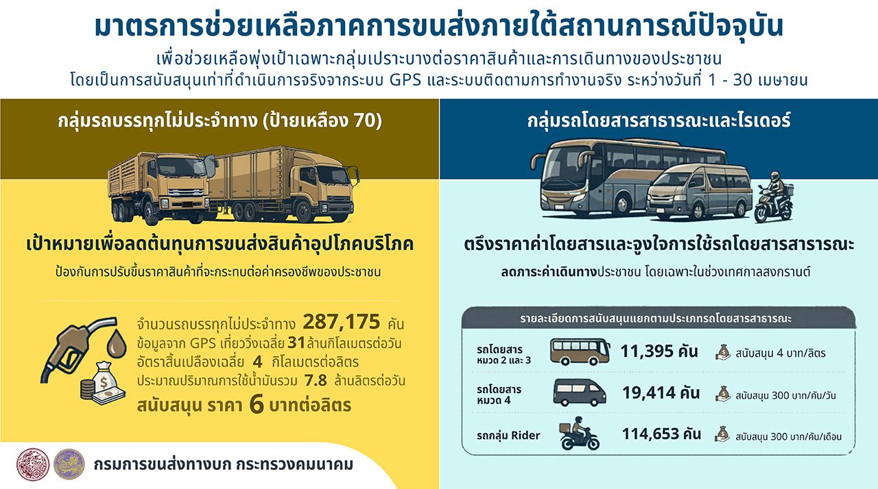 นายพิพัฒน์ รัชกิจประการ รองนายกรัฐมนตรีและรัฐมนตรีว่าการกระทรวงคมนาคม เปิดเผยถึงมาตรการ มาตรการช่วยเหลือผลกระทบด้านราคาน้ำมันในส่วนของภาคขนส่ง ซึ่งจะดำเนินการช่วยเหลือพุ่งเป้าเฉพาะกลุ่มเปราะบางต่อราคาสินค้าและการเดินทางของประชาชนว่า ขณะนี้กระทรวงคมนาคมได้พิจารณามาตรการช่วยเหลือโดยเป็นการสนับสนุนเท่าที่ดำเนินการจริงจากระบบ GPS และระบบติดตามการทำงานจริง ระหว่างวันที่ 1 – 30 เม.ย.2569 โดยจะบางมาตรการช่วยเหลือออกเป็น 2 กลุ่มใหญ่ คือ