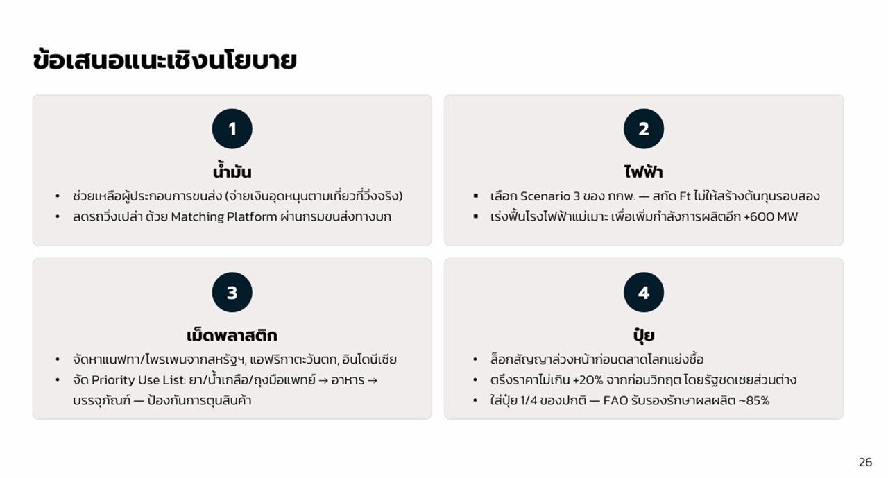 4.ปุ๋ย ล็อคสัญญาซื้อขายล่วงหน้า, ตรึงราคาในประเทศไม่เกิน 20% จากก่อนวิกฤติ โดยรัฐชดเชยส่วนต่าง ส่วนเกษตรกร ลดใช้ปุ๋ยเคมี