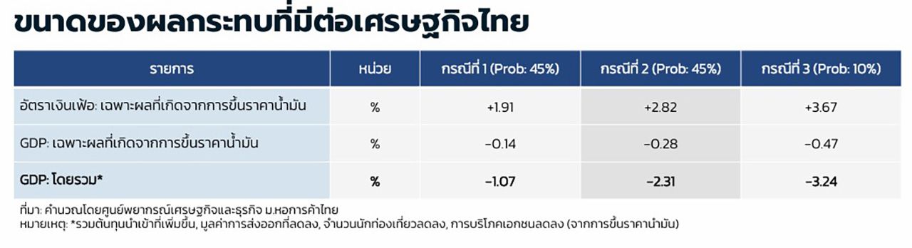อย่างไรก็ตาม ได้ประเมินผลกระทบครั้งนี้ไว้ 3 กรณี โดยกรณีที่ 1 และ 2 หากความขัดแย้งในตะวันออกกลางจบภายใน 3-6 เดือน ซึ่งมีโอกาสเกิดขึ้น 45% จะทำให้เงินเฟ้อทั่วไปเพิ่มขึ้นมาอยู่ที่ 1.91-2.82% จากกรอบเป้าหมายปีนี้ที่ 1-3% ส่วนจีดีพี เฉพาะผลกระทบจากราคานั้นที่เพิ่มขึ้น จะลดลง 0.14-0.28% จากคาดการณ์เดิมที่ขยายตัว 2% และจีดีพีโดยรวม ลดลงอีก 1.07-2.31% จากคาดการณ์เดิม และกรณีที่ 3 หากสยืดเยื้อตลอดทั้งปีนี้ ซึ่งมีโอกาสเกิดขึ้นประมาณ 10% เงินเฟ้อจะพุ่งขึ้นเป็น 3.67% ส่วนจีดีพีเฉพาะที่ได้รับผลกระทบจากราคาน้ำมันสูงขึ้น จะลดลงอีก 0.47% จากเดิม และจีดีพีภาพรวม ลดลงถึง 3.24% จากเดิม