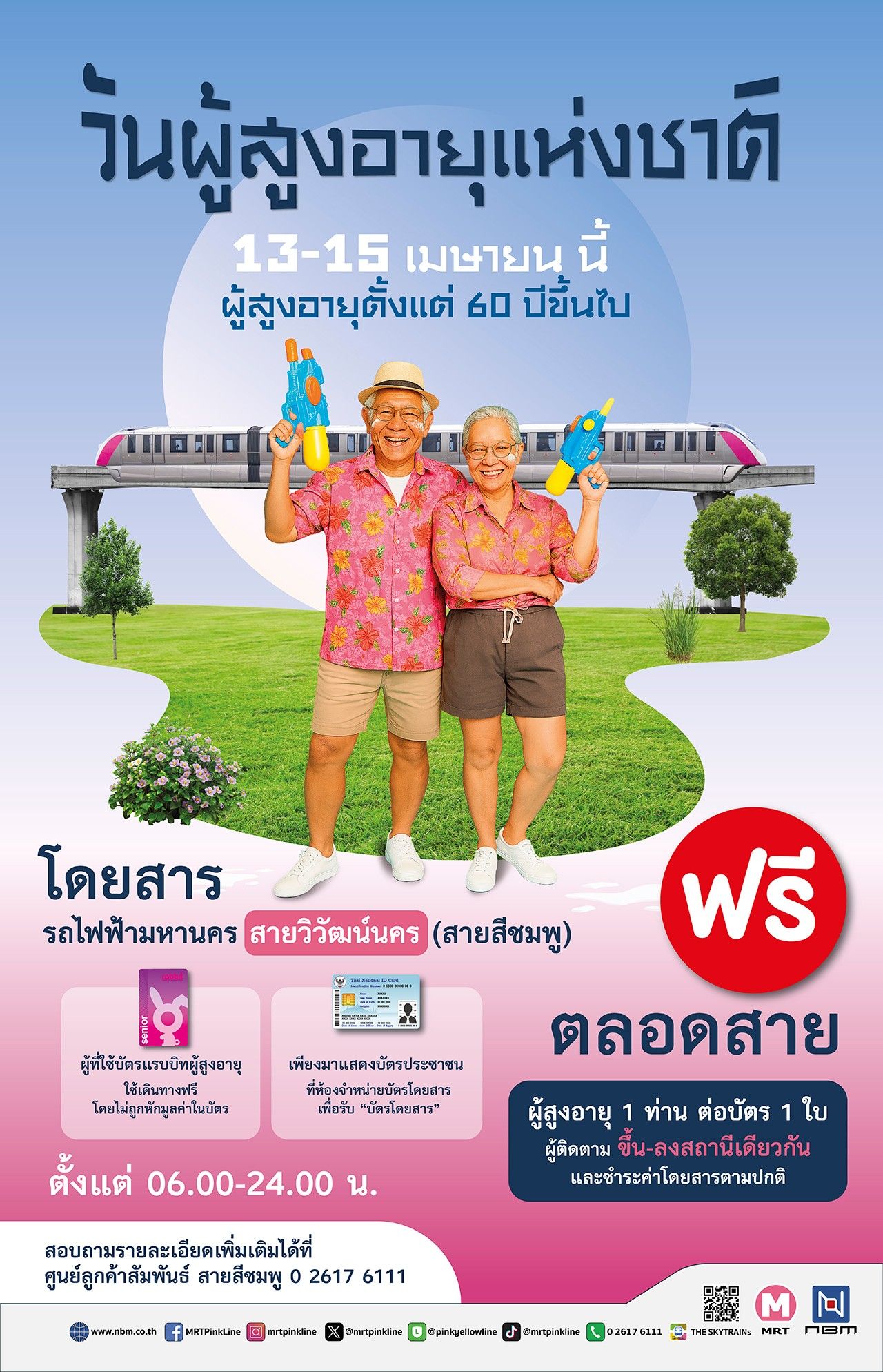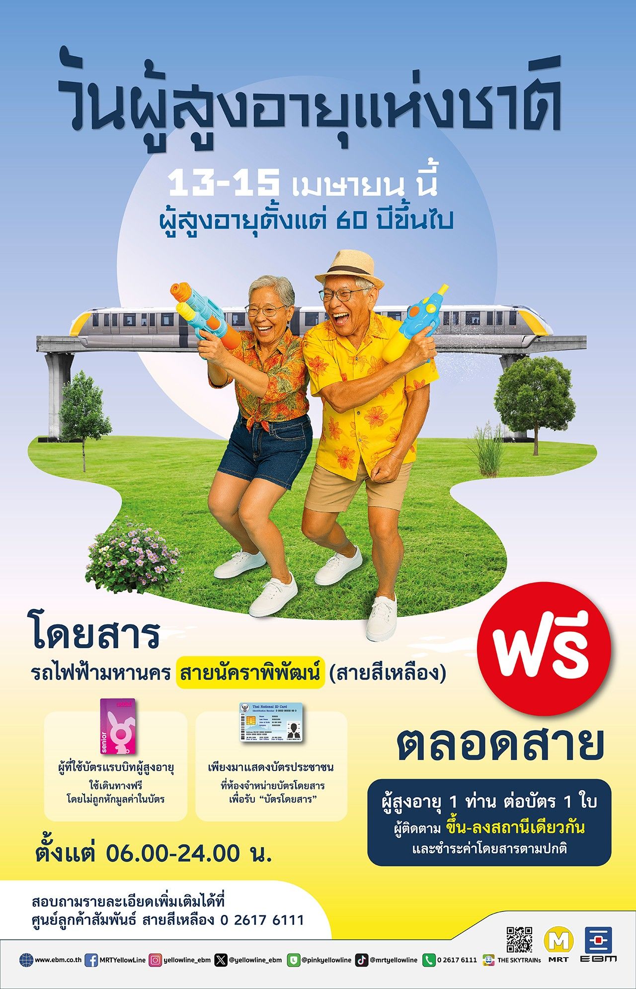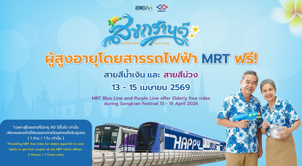 การรถไฟฟ้าขนส่งมวลชนแห่งประเทศไทย (รฟม.) ร่วมส่งความสุขรับเทศกาลสงกรานต์และวันผู้สูงอายุแห่งชาติปี 2569 ประกาศยกเว้นค่าโดยสารรถไฟฟ้า MRT ทั้ง 4 สาย สำหรับผู้ที่มีอายุ 60 ปีขึ้นไป ระหว่างวันที่ 13-15 เมษายน 2569 หวังส่งเสริมสถาบันครอบครัวและมาตรการประหยัดพลังงาน พร้อมจัดเต็มมาตรการความปลอดภัยขั้นสูงสุด ย้ำกฎเหล็กห้ามนำปืนฉีดน้ำบรรจุน้ำเข้าขบวนรถเด็ดขาด