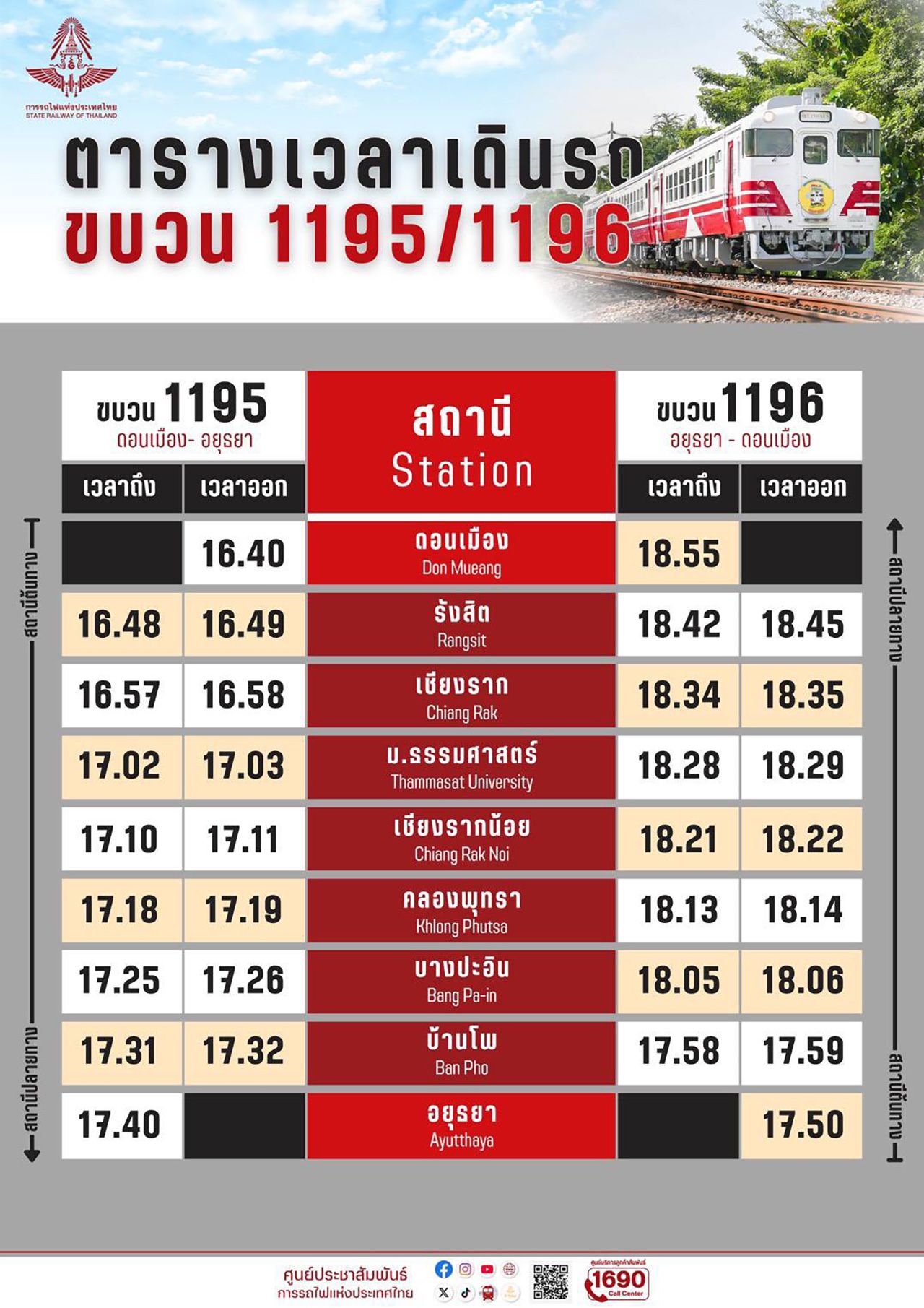 ทั้งนี้ ผู้โดยสารสามารถซื้อตั๋วโดยสารได้ที่สถานีรถไฟ พร้อมติดตามรายละเอียดตารางเดินรถ และอัตราค่าโดยสารเพิ่มเติมได้ที่ศูนย์บริการลูกค้าสัมพันธ์ โทรศัพท์ 1690 ตลอด 24 ชั่วโมง หรือผ่านเฟซบุ๊กแฟนเพจ “ทีมพีอาร์การรถไฟแห่งประเทศไทย”