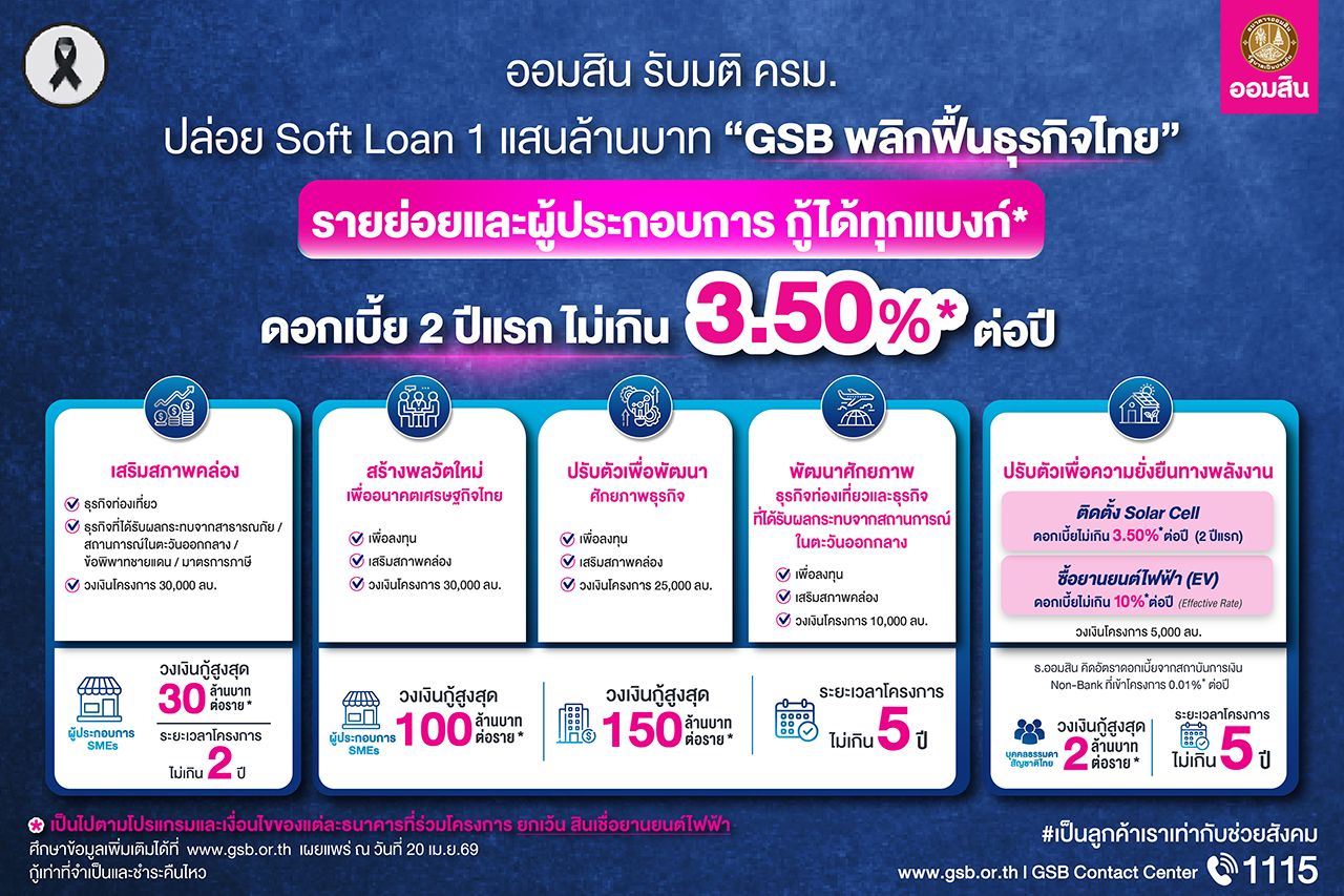 นายทรงพล ชีวะปัญญาโรจน์ ผู้อำนวยการธนาคารออมสิน เปิดเผยว่า ตามมติคณะรัฐมนตรี เมื่อวันที่ 11 เมษายน 2569 เห็นชอบการออกมาตรการดูแลผู้ที่ได้รับผลกระทบจากสถานการณ์วิกฤตพลังงาน ความไม่แน่นอนทางเศรษฐกิจและความขัดแย้งในต่างประเทศ โดยมอบหมายให้ธนาคารออมสินเป็นแกนหลักในการขับเคลื่อนมาตรการทางการเงินเพื่อเติมสภาพคล่องผ่าน โครงการสินเชื่อดอกเบี้ยต่ำ (Soft Loan) “GSB พลิกฟื้นธุรกิจไทย” วงเงิน 100,000 ล้านบาท มุ่งช่วยประชาชนและผู้ประกอบการ SMEs ปรับตัวรับมือวิกฤตที่ส่งผลกระทบต่อการดำรงชีวิตและการดำเนินธุรกิจ พร้อมสนับสนุนการเปลี่ยนผ่านสู่การใช้พลังงานทางเลือก โดยความร่วมมือของธนาคารพาณิชย์และสถาบันการเงินเฉพาะกิจทั้ง 16 แห่ง ในการส่งผ่านเงินทุนดอกเบี้ยต่ำไปยังกลุ่มเป้าหมายให้เร็วที่สุด