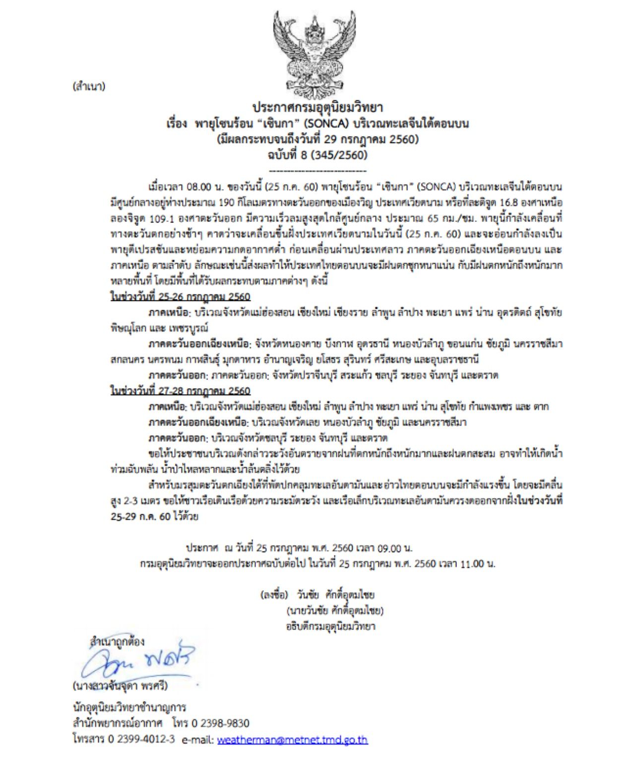 ประกาศกรมอุตุนิยมวิทยา พายุโซนร้อน “เซินกา” (SONCA) บริเวณทะเลจีนใต้ตอนบน ฉบับที่ 8 ลงวันที่ 25 กรกฎาคม 2560