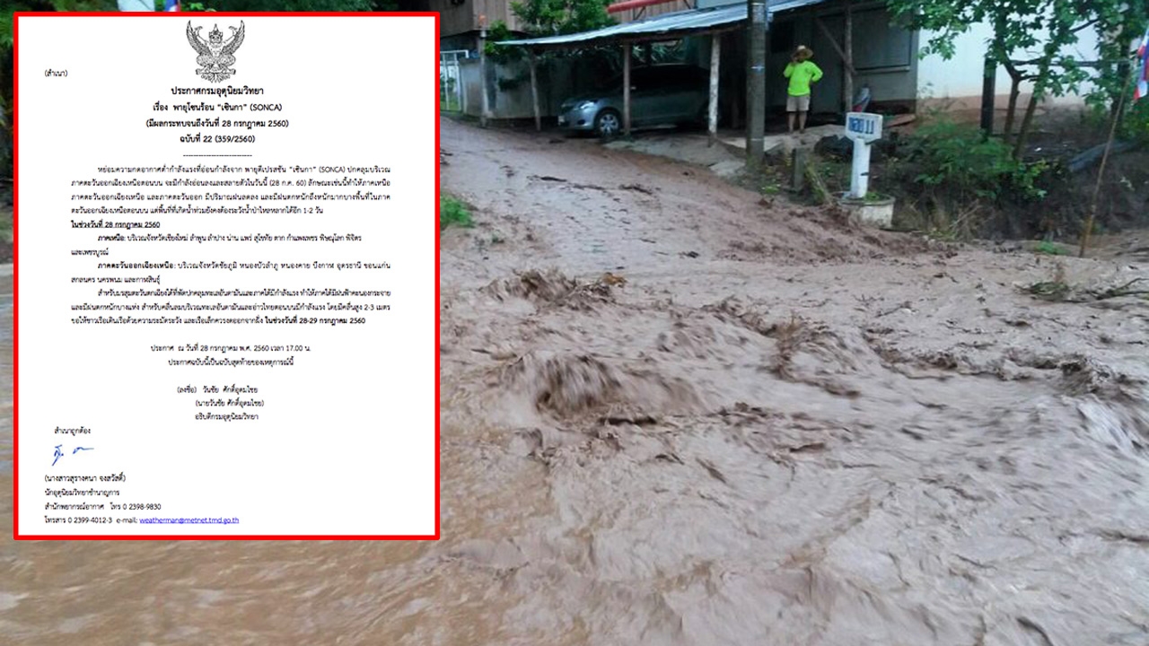 หย่อมความกดอากาศต่ำกำลังแรงที่อ่อนกำลังจาก พายุดีเปรสชัน “เซินกา” (SONCA) ปกคลุมบริเวณ ภาคตะวันออกเฉียงเหนือตอนบน จะมีกำลังอ่อนลงและสลายตัวในวันนี้ (28 ก.ค. 60) ลักษณะเช่นนี้ทำให้ภาคเหนือ ภาคตะวันออกเฉียงเหนือ และภาคตะวันออก มีปริมาณฝนลดลง และมีฝนตกหนักถึงหนักมากบางพื้นที่ในภาคตะวันออกเฉียงเหนือตอนบน แต่พื้นที่ที่เกิดน้ำท่วมยังคงต้องระวังน้ำป่าไหลหลากได้อีก 1-2 วัน