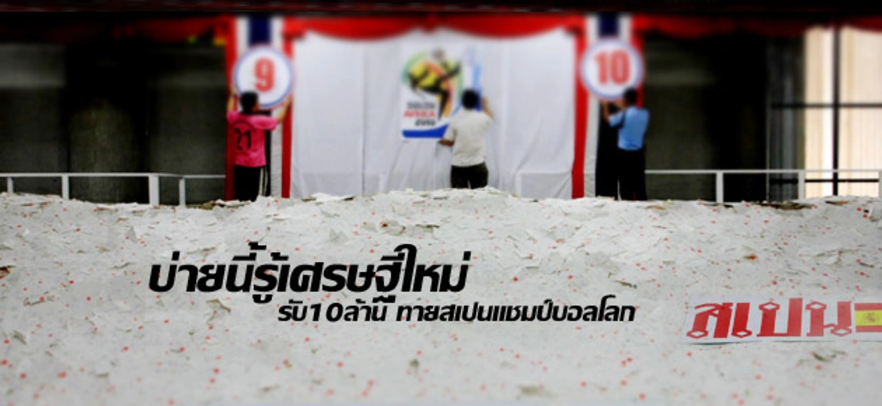 ลุ้นระทึกมอบโชคคนดวงมหาเฮงแห่งปี ใครจะคว้าเงินสด 10 ล้านบาทไปครอง และรางวัลเงินสดกับรางวัลพิเศษอีกมากมายหลากหลาย ในการจับสลากไปรษณียบัตรทายผลแชมป์ฟุตบอลโลก 2010 ที่ "ไทยรัฐ" จัดขึ้นอย่างยิ่งใหญ่ โดยพิธีจับสลากมอบโชค ดีเดย์บ่ายโมงตรง วันที่ 10 ส.ค.นี้ "อิคนาซิโอ ซากัส" เอกอัครราชทูตสเปน ประจำประเทศไทย เป็นผู้จับรางวัลที่ 1 แก่แฟนบอลผู้โชคดี