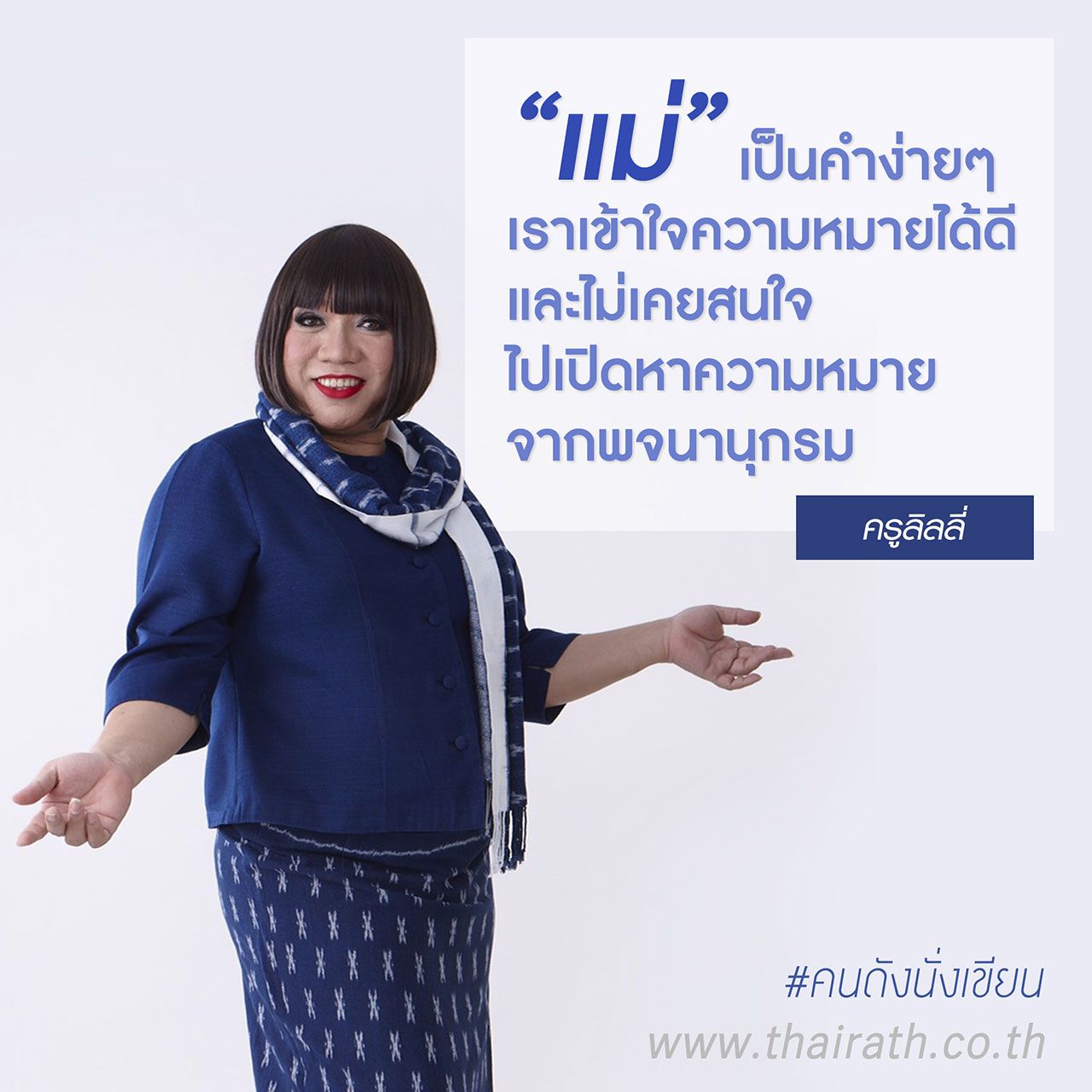 ภาษาไทยวันละคำวันนี้ คุณครูลิลลี่ ขอเสนอคำว่า “แม่” คำว่า แม่ เป็นคำนาม แปลว่า หญิงผู้ให้กำเนิดหรือเลี้ยงดูลูก คำที่ลูกเรียกหญิงผู้ให้กำเนิดหรือเลี้ยงดูตน หรือคำที่ผู้ใหญ่เรียกผู้หญิงที่มีอายุน้อยกว่าด้วยความสนิทสนมหรือรักใคร่เป็นต้น ว่า แม่นั่น แม่นี่ นอกจากนั้นยังใช้คำว่า แม่ นำหน้านามเพศหญิง แปลว่า ผู้เป็นหัวหน้า เช่น แม่บ้าน แม่ค้า แม่ครัว คำว่าแม่ ยังใช้เรียกสัตว์ตัวเมียที่มีลูก เช่น แม่ม้า แม่วัว หรือ เรียกคนผู้เป็นหัวหน้าหรือเป็นนาย โดยไม่จำกัดว่าเป็นเพศหญิงหรือเพศชาย เช่น แม่ทัพ แม่กอง ยังไม่หมดแค่นั้นนะคะ คำว่า แม่ ยังใช้เป็นคำยกย่องเทวดาผู้หญิงบางพวก เช่น แม่คงคา แม่ธรณี แม่โพสพ เป็นต้นค่ะ
