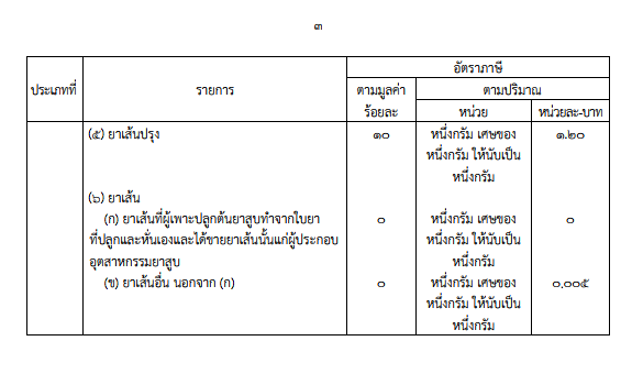 ในส่วนของของการเก็บภาษี บุหรี่ แบ่งเป็น 2 ส่วนคือ เก็บตามปริมาณ ไม่ว่าจะเป็นบุหรี่ถูกหรือแพงจะเก็บ 1.20 บาทต่อมวน ตกซองละ 24 บาท ส่วนที่สองคือเก็บตามมูลค่า แบ่งเป็น 2 ประเภท คือ 1.ราคาต่ำกว่าซองละ 60 บาท เก็บ 20% หรือประมาณ 4-15 บาท โดยในช่วง 2 ปีแรกจะเก็บ 20% หลังจากนั้นจะขึ้นเป็น 40% 2.ราคาสูงกว่า 60 บาท จะปรับขึ้น 40% หรือประมาณซองละ 2-10 บาท
