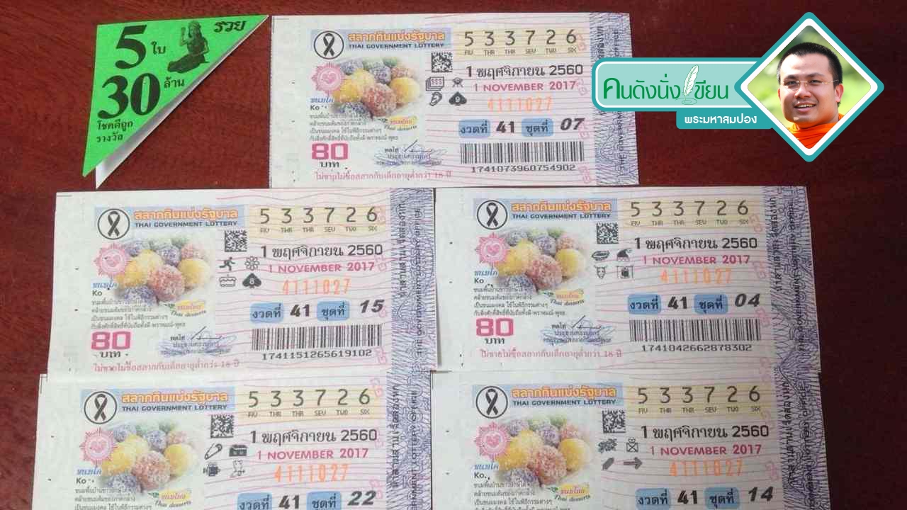 โยมทุกท่าน เวลาที่เราเดินผ่านแผงลอตเตอรี่ที่เขียนว่า “ซื้อแล้วรวย” อย่าไปซื้อนะโยม เพราะคำผวนมันหมายถึง “ซวยแล้วลื้อ” โยมสังเกตไหม ทำไมถึงซื้อไม่ถูกสักที