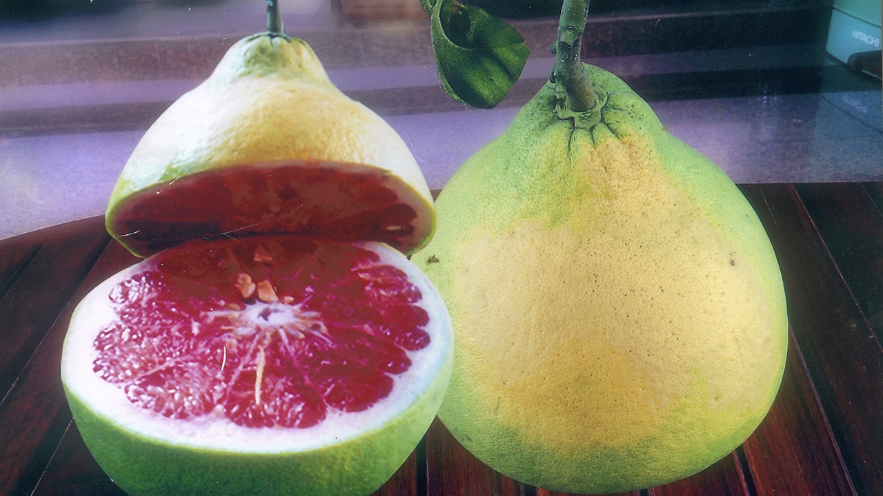 ส้มโอชนิดนี้ ถูกพัฒนาสายพันธุ์ขึ้นมาจากส้มโอพันธุ์ดั้งเดิมของส้มโอ อ.บางนรา จ.นราธิวาส จนได้ส้มโอสายพันธุ์ใหม่ แล้วถูกตั้งชื่อว่า “ส้มโอแดงบางนรา” และเรียกกันเรื่อยมาจนกระทั่งปัจจุบัน มีลักษณะประจำพันธุ์คือ ผลจะเป็นรูปกลมรีหรือรูปไข่กลับกว้าง ปลายผลมีจุกใหญ่แบ่งเป็นร่องหลายร่องอย่างชัดเจน บริเวณก้นผลตัดตรงและกลางก้นผลจะบุ๋มเล็กน้อย เปลือกผลบางกว่าเปลือกผลของส้มโอพันธุ์ทั่วไป ผลโตเต็มที่มีน้ำหนักเฉลี่ยระหว่าง 2–2.5 กิโลกรัม เนื้อผลสุกหรือถุงน้ำเป็นสีแดงเข้มน่าชมมาก รสชาติหวานกรอบไม่เป็นดานหรือแข็งเหมือนกับเนื้อส้มโอพันธุ์ทั่วไป รับประทานอร่อยยิ่งนัก ใน 1 ผล จะมีเมล็ดไม่มากเช่นส้มโออื่น มีดอกและติดผลดกโดยธรรมชาติตามฤดูกาล