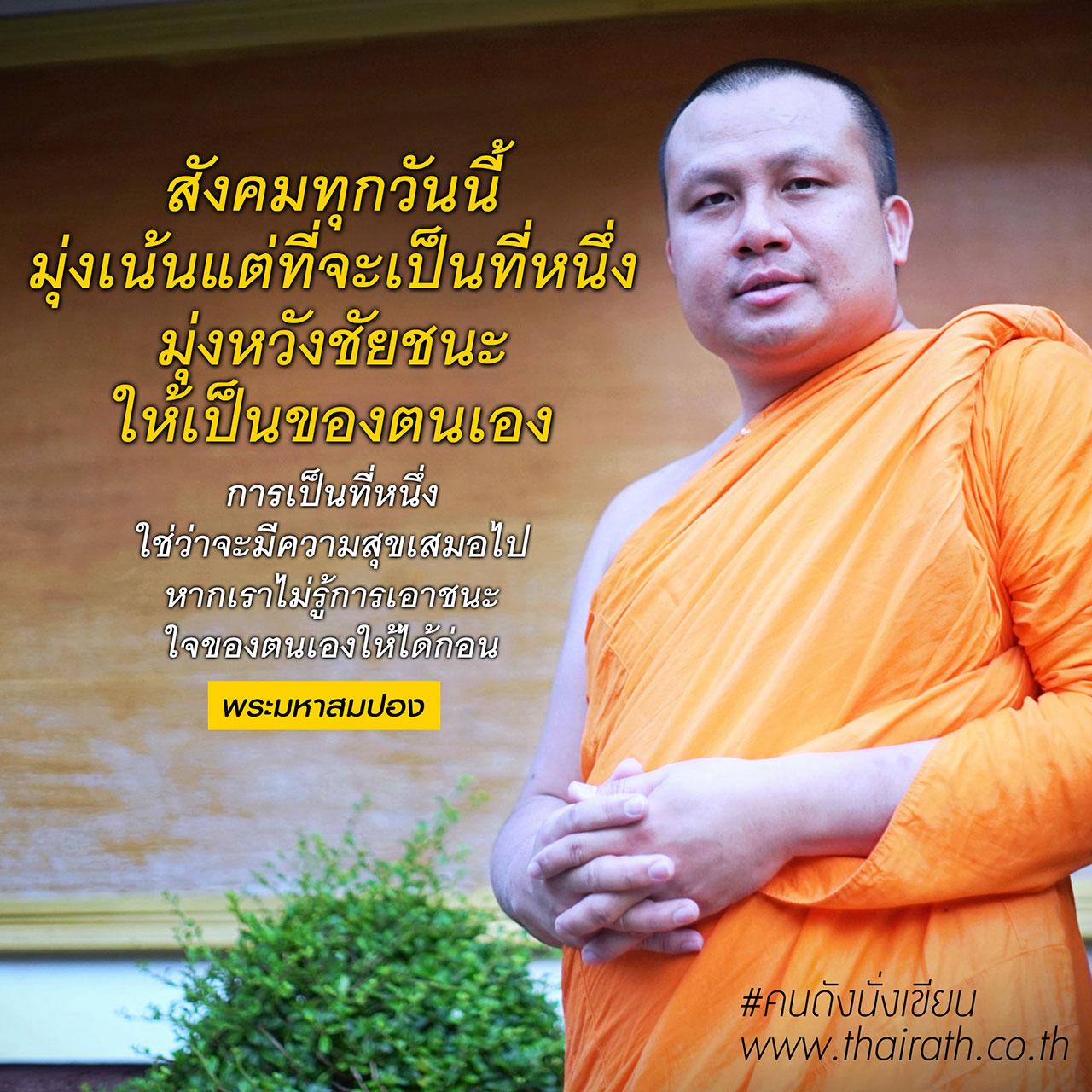 ขอความสุขสวัสดีจงมีแด่ทุกๆ ท่าน พบกับพระมหาสมปองอีกเหมือนเดิม จากที่เกริ่นไปคำกลอนไว้เบื้องต้น เป็นเพราะว่าสังคมทุกวันนี้มุ่งเน้นแต่ที่จะเป็นที่หนึ่ง มุ่งหวังชัยชนะให้เป็นของตนเอง โยมรู้ไหมว่า การเป็นที่หนึ่งใช่ว่าจะมีความสุขเสมอไป หากเราไม่รู้การเอาชนะใจของตนเองให้ได้ก่อน เหมือนคำสอนที่ว่า ชนะอื่นหมื่นแสนแม้นพันหน ยังไม่สู้การชนะใจตนเพียงหนเดียว คนที่เอาชนะใจตนได้ สิ่งที่จะตามมาคือความสุข