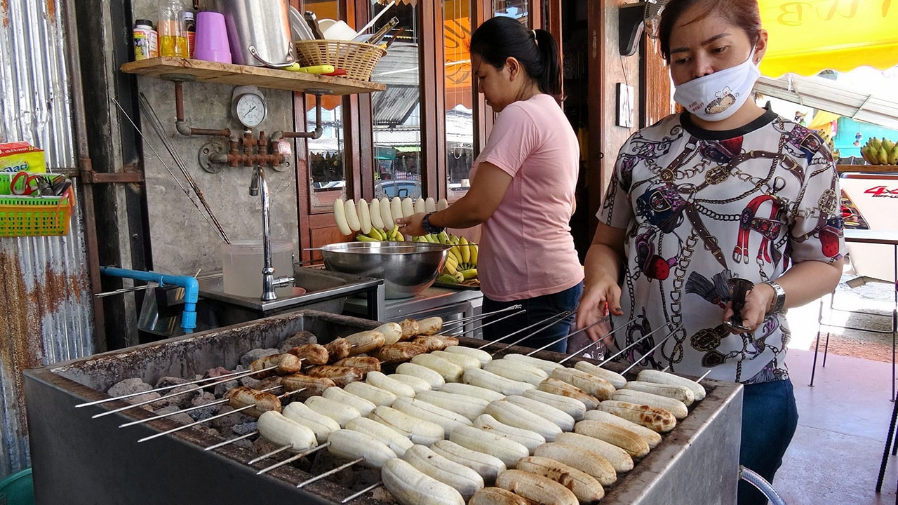 ตัวอย่าง กล้วยปิ้งทับ ราดน้ำจิ้มรสเด็ด ใช้น้ำตาลโตนด เติมเนื้อมะพร้าวอ่อน เจ้าแรกเมืองระยอง น.ส.นีรนุช ขุนจันทร์ดี อายุ 25 ปี ตั้งขายอยู่ที่ “ร้านจับทับ” ริมถนนราษฎร์บำรุง ต.เนินพระ อ.เมือง จ.ระยอง