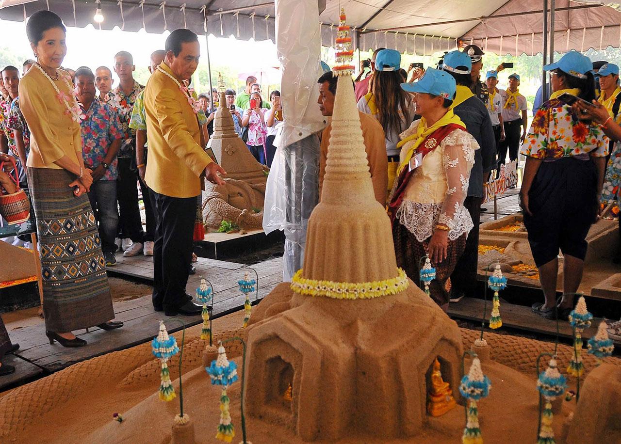 ต่อมาเวลา 16.00 น. พล.อ.ประยุทธ์ จันทร์โอชา นายกรัฐมนตรี และนางนราพร จันทร์โอชา ภรรยา เดินทางมาชมงาน “เถลิงศกสุขสันต์ มหาสงกรานต์ ตำนานไทย” โดยหลังจากถวายสักการะพระบรมราชานุสรณ์พระบาทสมเด็จพระจุลจอมเกล้าเจ้าอยู่หัว สรงน้ำพระพุทธกำเนิดกาสาวพัตร์ แล้วได้เข้ามาชมการแข่งขันก่อพระเจดีย์ทรายในสนามเสือป่า ซึ่งผู้สื่อข่าวรายงานว่า ทันทีที่ พล.อ.ประยุทธ์ มาถึง ได้มีขบวนกลองยาวรำวงมาตรฐานจากสำนักการสังคีต กรมศิลปากร บรรเลงต้อนรับ จากนั้น นายกฯเดินชมพระเจดีย์ทรายของทีมที่เข้าร่วมการแข่งขันทั้ง 44 ทีม พร้อมทักทายประชาชนที่มาต้อนรับอย่างเป็นกันเอง