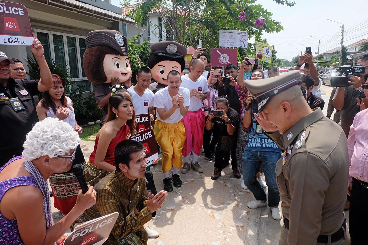 สำหรับการดูแลความปลอดภัยประชาชนช่วงสงกรานต์ที่จะถึงในสัปดาห์นี้ ผู้สื่อข่าวรายงานว่าเมื่อช่วงบ่ายวันที่ 8 เม.ย. ที่ สน.คันนายาว พล.ต.อ.เฉลิมเกียรติ ศรีวรขาน รอง ผบ.ตร. พล.ต.ต.ภาณุรัตน์ หลักบุญ รอง ผบช.น. เดินทางมาตรวจมาตรการป้องกันปราบปรามอาชญากรรม โครงการประชารัฐ ร่วมใจดูแลความปลอดภัยบ้านประชาชนเทศกาลสงกรานต์ที่ สน.คันนายาว และไปที่บ้านนายปอยฝ้าย เบญจมาลัยพร หรือ “ปอยฝ้าย มาลัยพร” อายุ 41 ปี ศิลปินนักร้องหมอลำชื่อดัง เจ้าของบทเพลงจังซี่มันต้องถอน ภายในหมู่บ้านฮาบิเทีย โมทิพ ถนนปัญญารามอินทรา เขตคลองสามวา กทม. ที่เข้าโครงการ โดยนายปอยฝ้ายได้โชว์เพลงหมอลำซิ่งที่แต่งให้กับโครงการสร้างความครื้นเครงก่อนรดน้ำดำหัวขอพร พล.ต.อ.เฉลิมเกียรติ เพื่อความเป็นสิริมงคล จากนั้น นายปอยฝ้ายกล่าวว่า ปีนี้เป็นปีแรกที่เข้าร่วมโครงการฝากบ้านไว้กับตำรวจ รู้สึกอุ่นใจและวางใจ ฝากถึงประชาชนขอให้เข้าร่วมโครงการ เพื่อที่จะได้เดินทางไปท่องเที่ยวได้อย่างสบายใจ และขอให้ประชาชนเล่นน้ำสงกรานต์อย่างดีงาม รักษาวัฒนธรรมประเพณีไทยและการแต่งชุดไทยโบราณ ไม่แต่งกายล่อแหลม งดเว้นการขับขี่รถยนต์ขณะเมาสุราด้วย