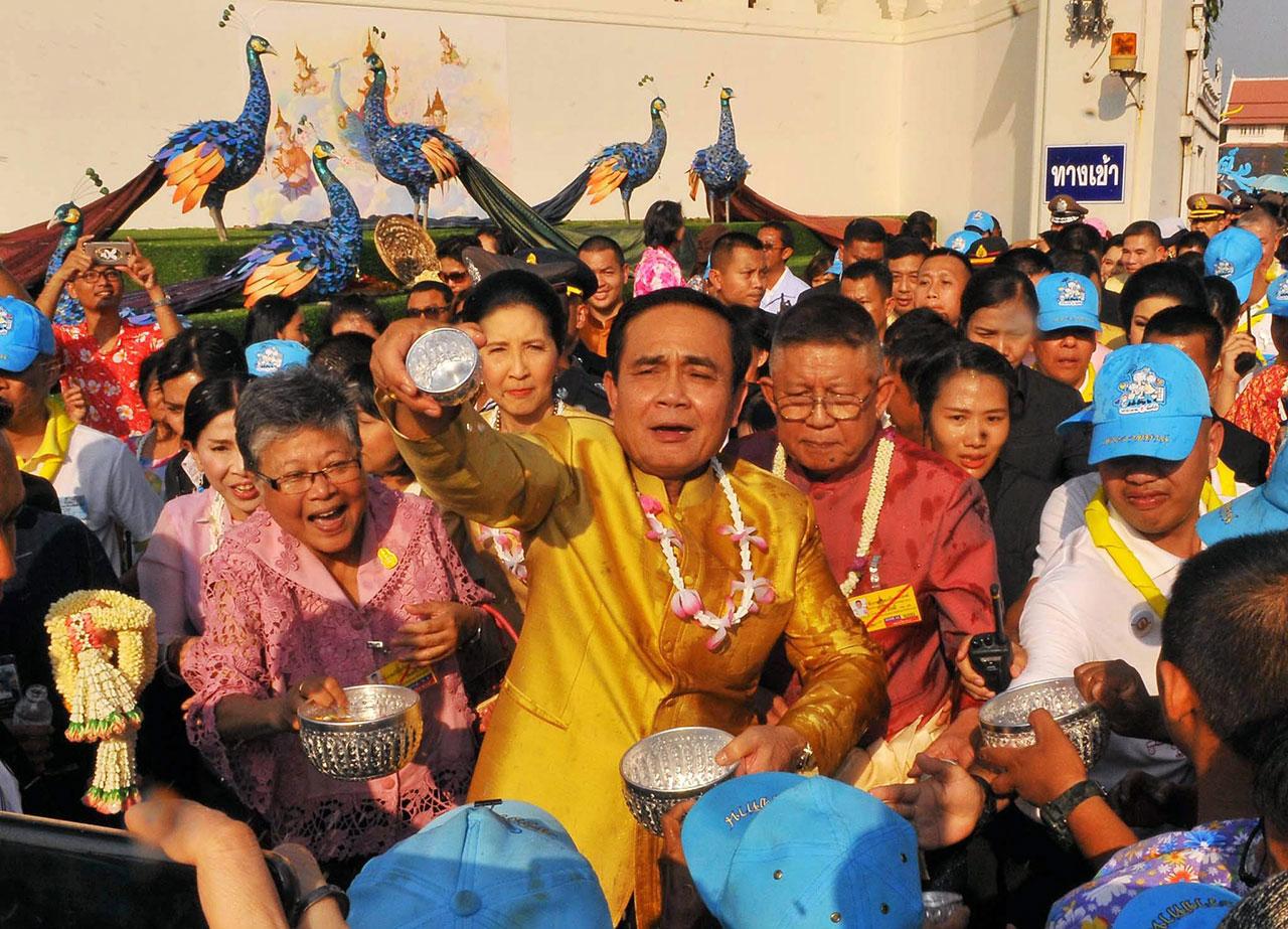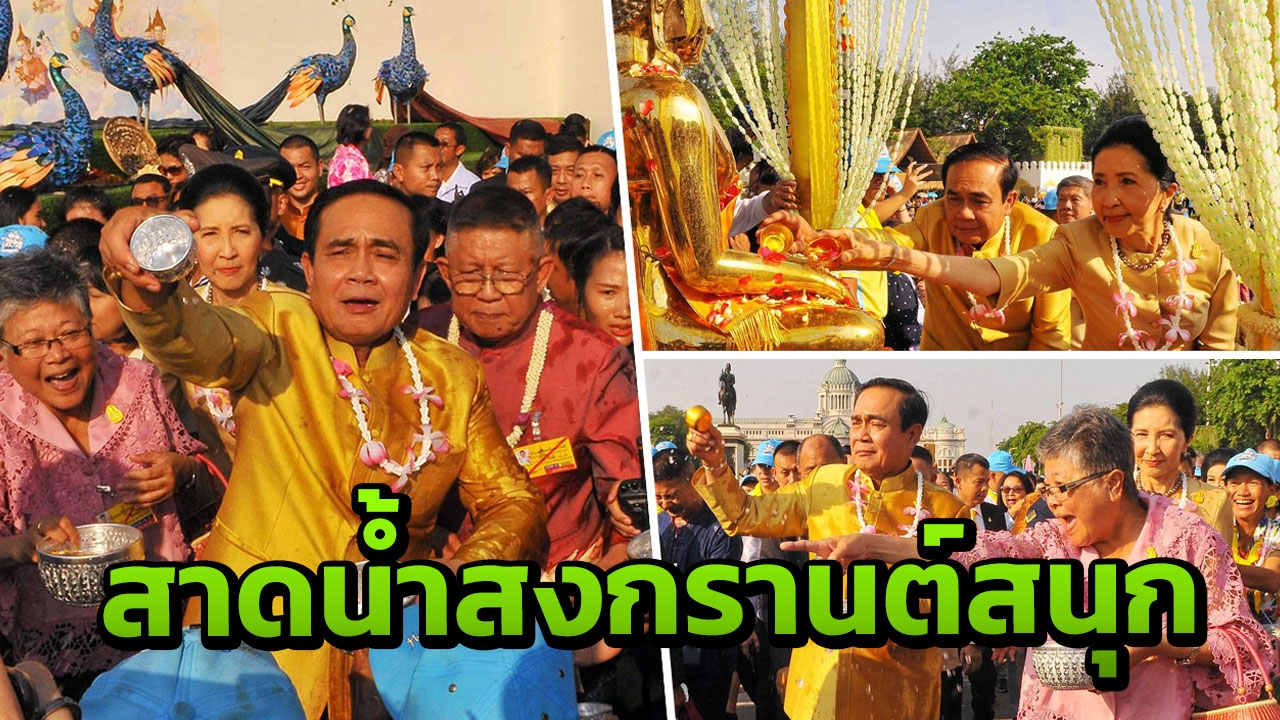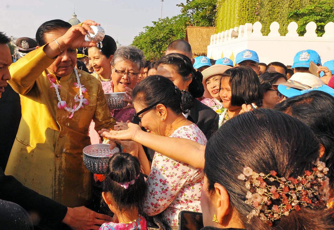 ทั้งนี้ พล.อ.ประยุทธ์กล่าวว่า ขอให้ทุกคนมีความสุขในวันสงกรานต์ ช่วยกันทำความดีถวายสมเด็จพระเจ้าอยู่หัว สมเด็จพระนางเจ้าสิริกิติ์ พระบรมราชินีนาถ ในรัชกาลที่ 9 และพระบรมวงศานุวงศ์ทุกพระองค์ ขอให้สงกรานต์ปีนี้เป็นสงกรานต์แห่งความสุข ปลอดภัยทั้งชีวิตและทรัพย์สิน ส่วนการเดินทางขอให้ปลอดภัยไม่มีอุปสรรค เพื่อไปทำประโยชน์แก่ครอบครัว แสดงถึงความกตัญญูกตเวที และขอให้ทำความดีในวันนี้ เพื่อสถาบันพระมหากษัตริย์อันเป็นที่รักยิ่งของพวกเราทุกคน และขอให้ทำความดีเพื่อแผ่นดิน ทำดีด้วยใจ และทำอย่างสม่ำเสมอตลอดไป ประเทศไทยร่มเย็นเป็นสุขแน่นอน ขอให้ทุกคนมีความสุข ซึ่งต่อมานายกรัฐมนตรียังได้เล่นสงกรานต์ สาดน้ำอบน้ำปรุงจากขันเงินร่วมกับประชาชนที่มาร่วมงานกันอย่างสนุกสนานบริเวณพระลานพระราชวังดุสิตก่อนจะเดินทางกลับ