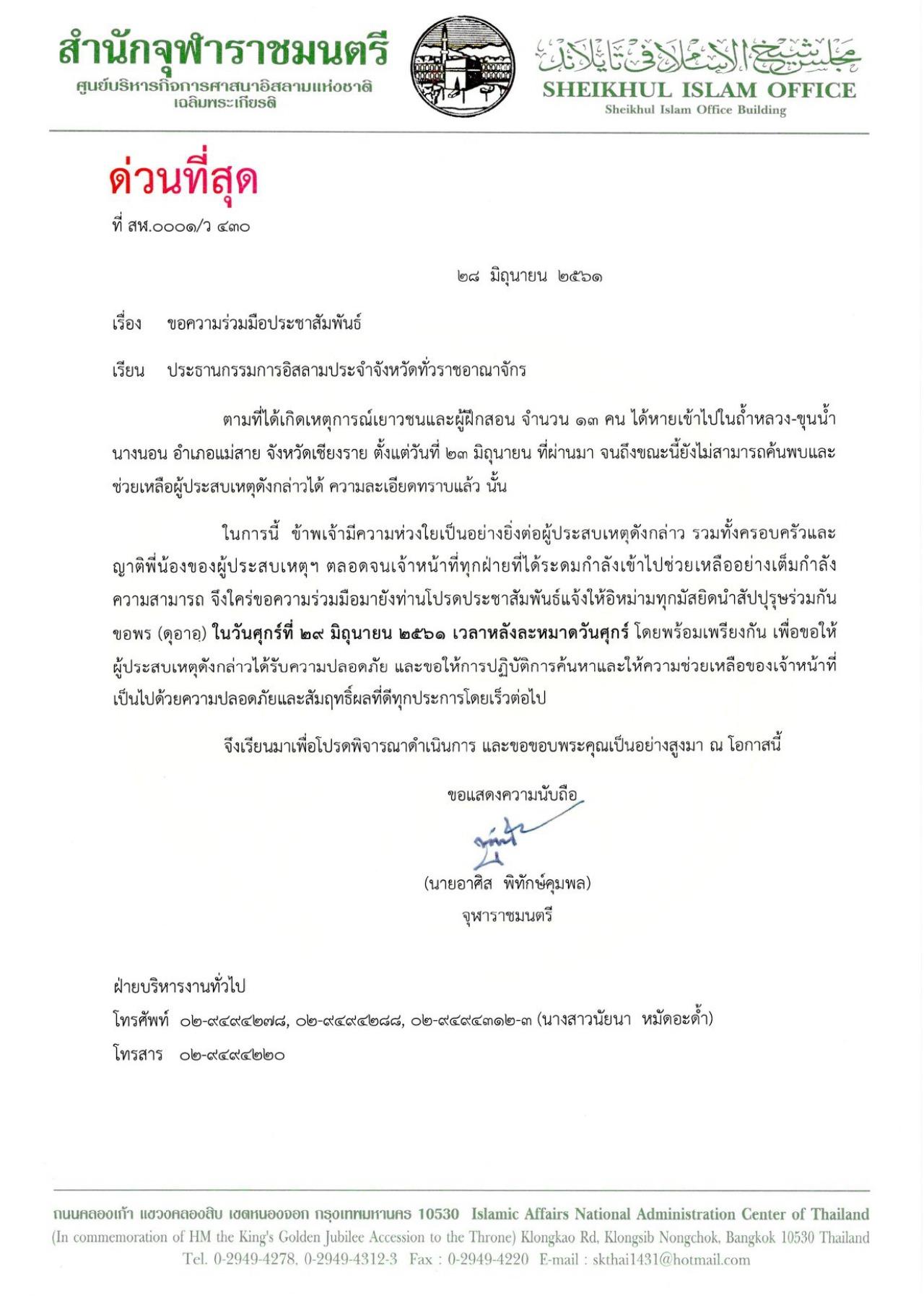 เมื่อ 28 มิ.ย.2561 นายอาศิส พิทักษ์คุมพล จุฬาราชมนตรี ได้มีหนังสือขอความร่วมมือไปยังประธานคณะกรรมการอิสลามประจำจังหวัดทุกจังหวัดทั่วประเทศว่า ตามที่เกิดเหตุการณ์เยาวชนและผู้ฝึกสอนได้หายเข้าไปในถ้ำหลวง-ขุนน้ำนางนอน อ.แม่สาย จ.เชียงราย มาตั้งแต่วันที่ 23 มิ.ย.ที่ผ่านมา จนถึงขณะนี้ยังไม่สามารถค้นพบและช่วยเหลือผู้ประสบภัยได้ ในการนี้ข้าพเจ้ามีความห่วงใยเป็นอย่างยิ่งต่อผู้ประสบภัยดังกล่าว รวมทั้งครอบครัวและญาติพี่น้องของผู้ประสบภัย ตลอดจนเจ้าหน้าที่ทุกฝ่ายที่ได้ระดมกำลังเข้าไปช่วยเหลืออย่างเต็มกำลังความสามารถ