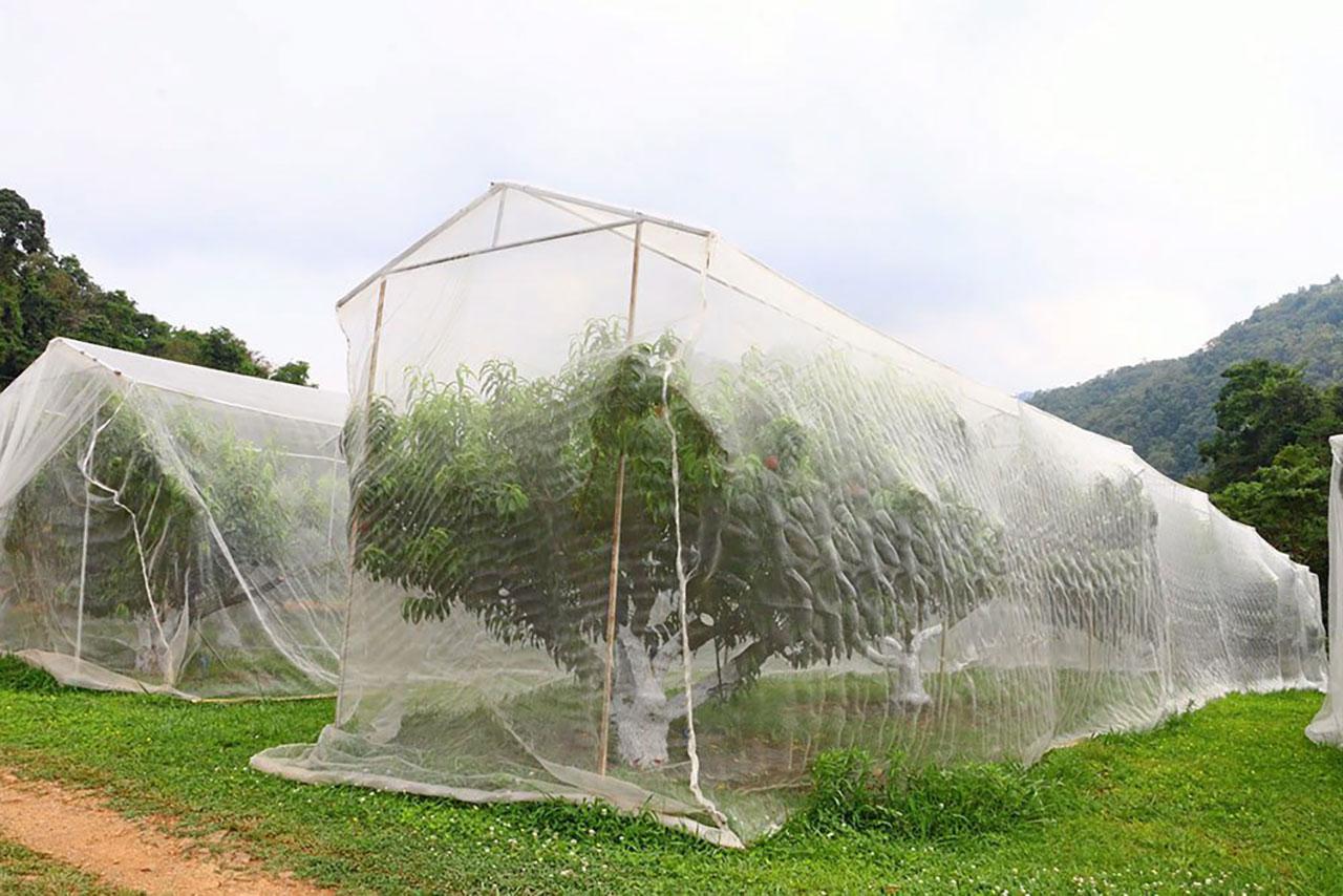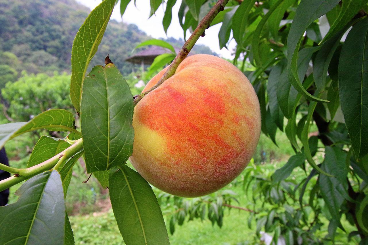...ทางโครงการหลวงจึงศึกษาวิจัยมาเรื่อย จนได้พันธุ์ลูกผสม และหลังจากจับมือกับไต้หวัน นำพีชไต้หวันมาปรับพันธุ์ จนได้พันธุ์ลูกผสม อำพัน, อ่างขาง 1-2-3 และ 4 พร้อมพัฒนาวิธีการปลูกและดูแลรักษา กางมุ้งให้กับแปลงพีชเพื่อป้องกันลูกเห็บตก ป้องกันแมลงวันทองเจาะผล เพื่อให้พีชมีผิวสวยน่ารับประทาน และทนต่อการขนส่ง”