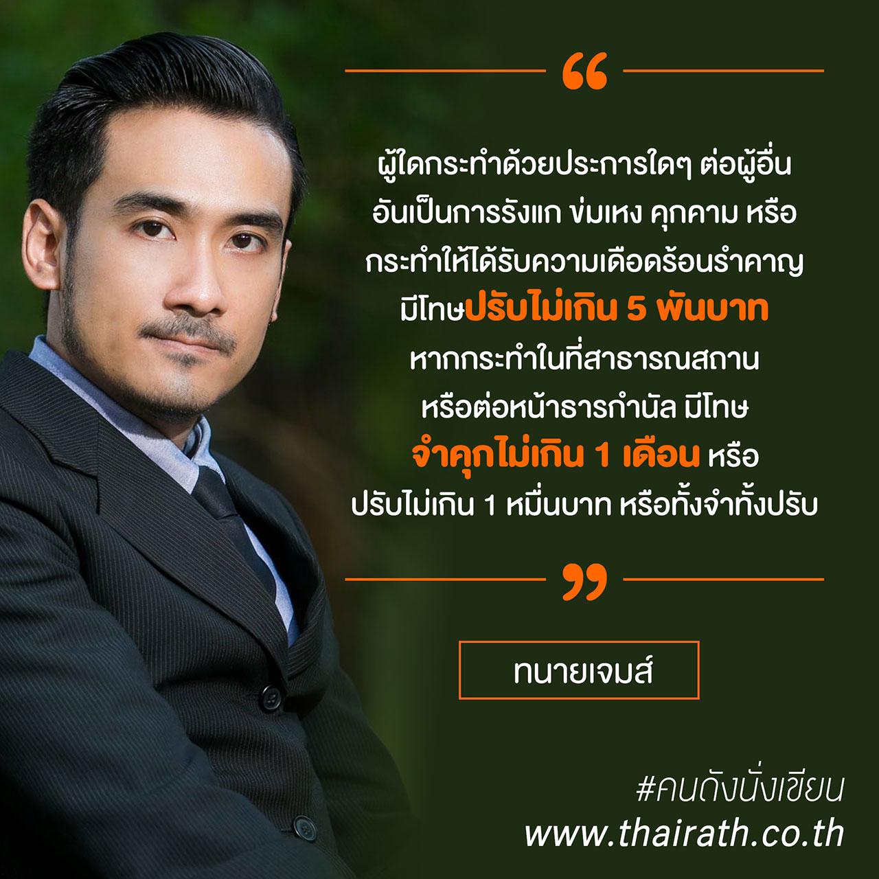 มาตรา 397 ผู้ใดกระทำด้วยประการใดๆ ต่อผู้อื่น อันเป็นการรังแก ข่มเหง คุกคาม หรือกระทำให้ได้รับความอับอาย หรือเดือดร้อนรำคาญ ต้องระวางโทษปรับไม่เกินห้าพันบาท