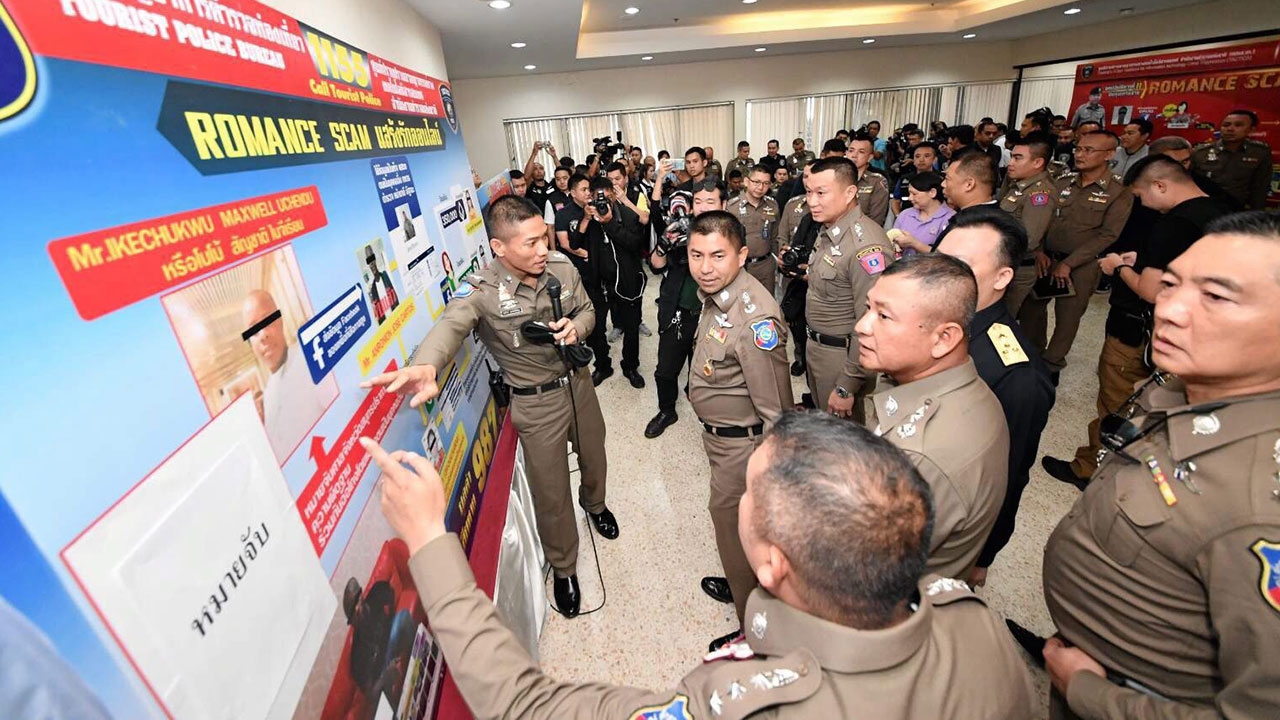 พล.ต.ต.สุรเชษฐ์ หักพาล รองผบช.ทท. แถลงข่าวจับกุม 8 เครือข่าย แสร้งรักออนไลน์ โรแมนซ์ สแกม ได้ผู้ต้องหาชาวไนจีเรียและชาวไทยรวม 17 คน ออกอุบายหลอกสาวใหญ่ 48 คน ผ่านเฟซบุ๊ก หลงเชื่อโอนเงินให้คนร้ายรวมเสียหาย 5.9 ล้านบาท.